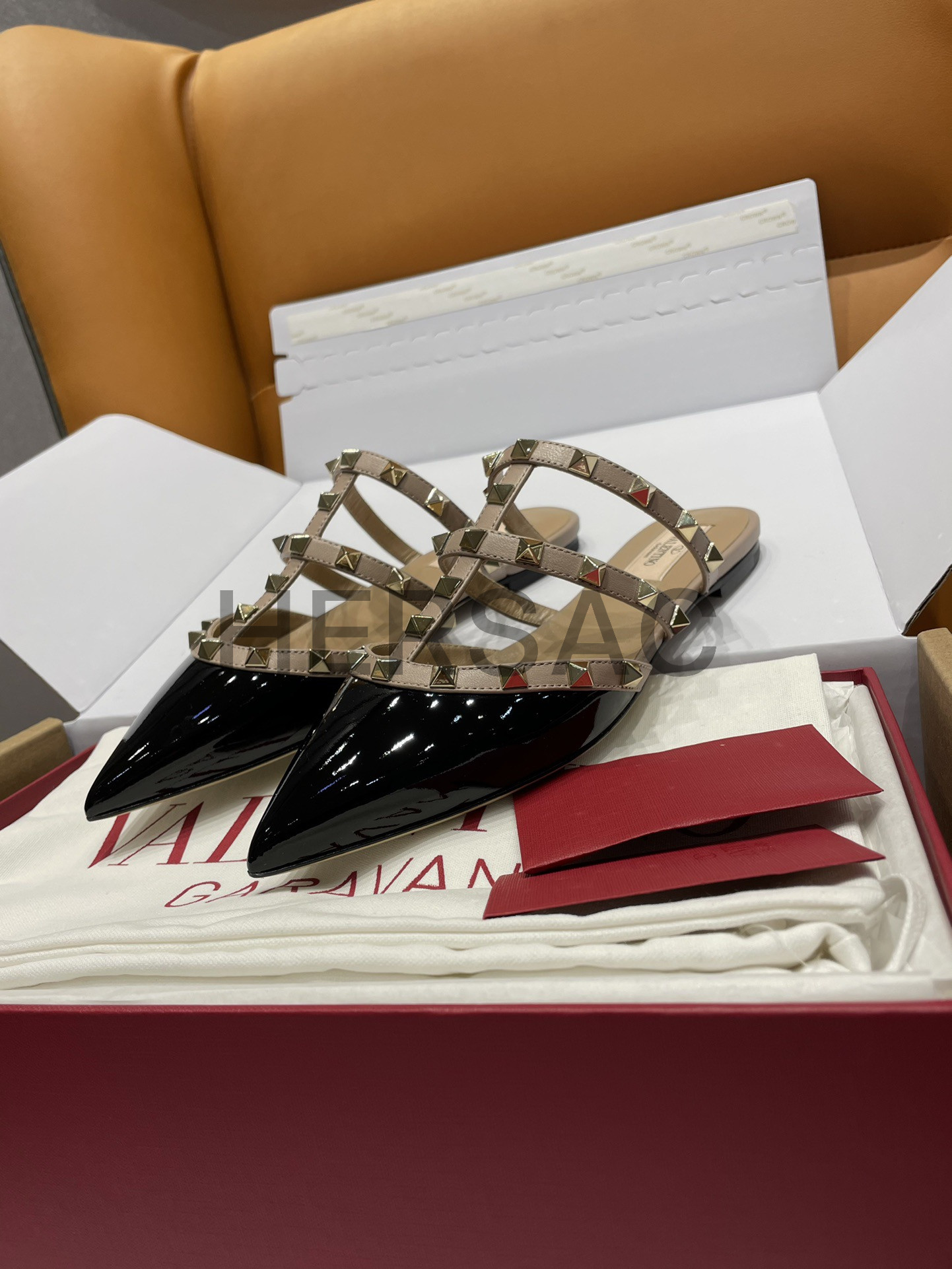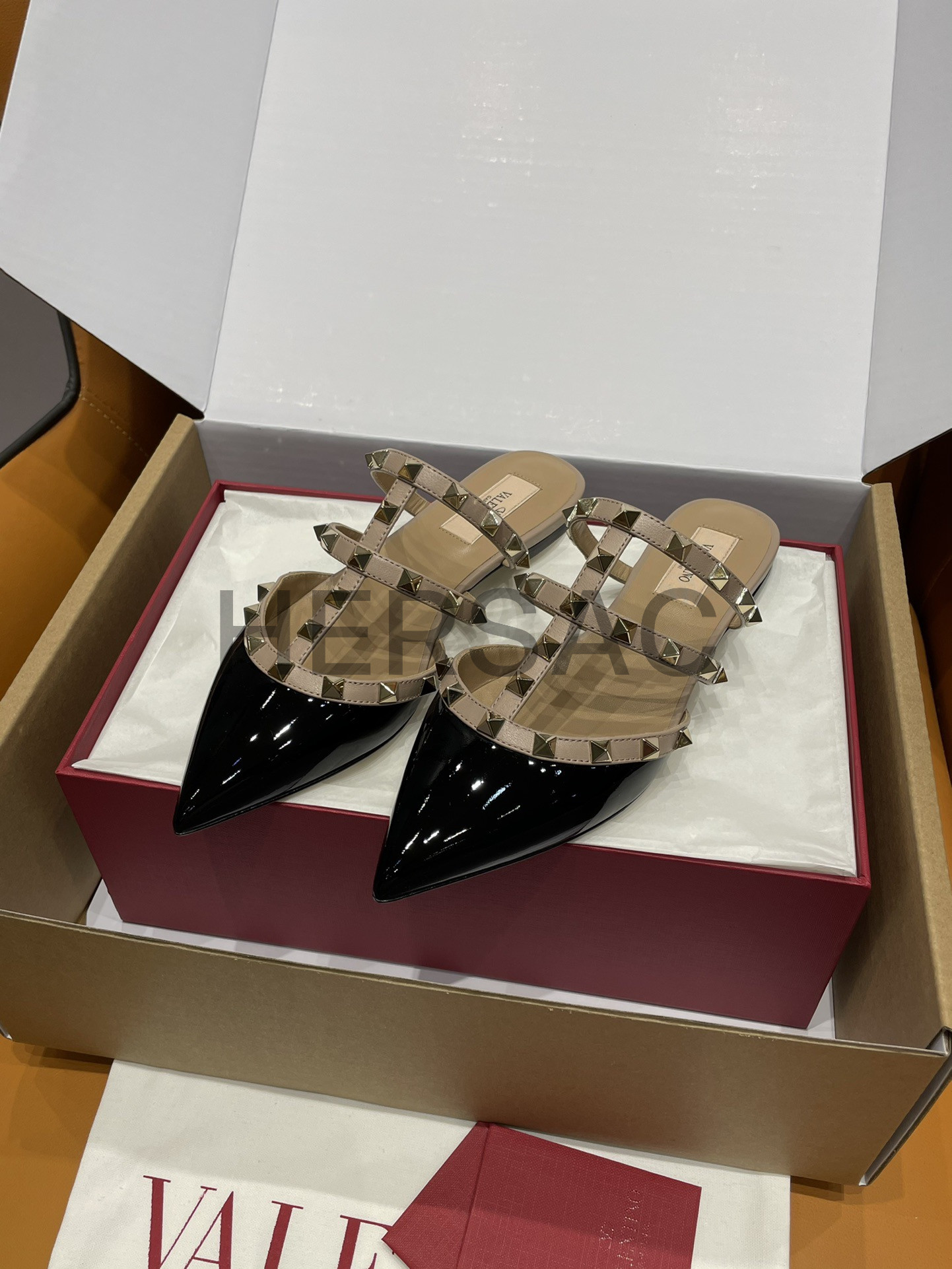발렌티노 페이턴트 가죽 락스터드 뮬 7W2S0H15VNW_N91