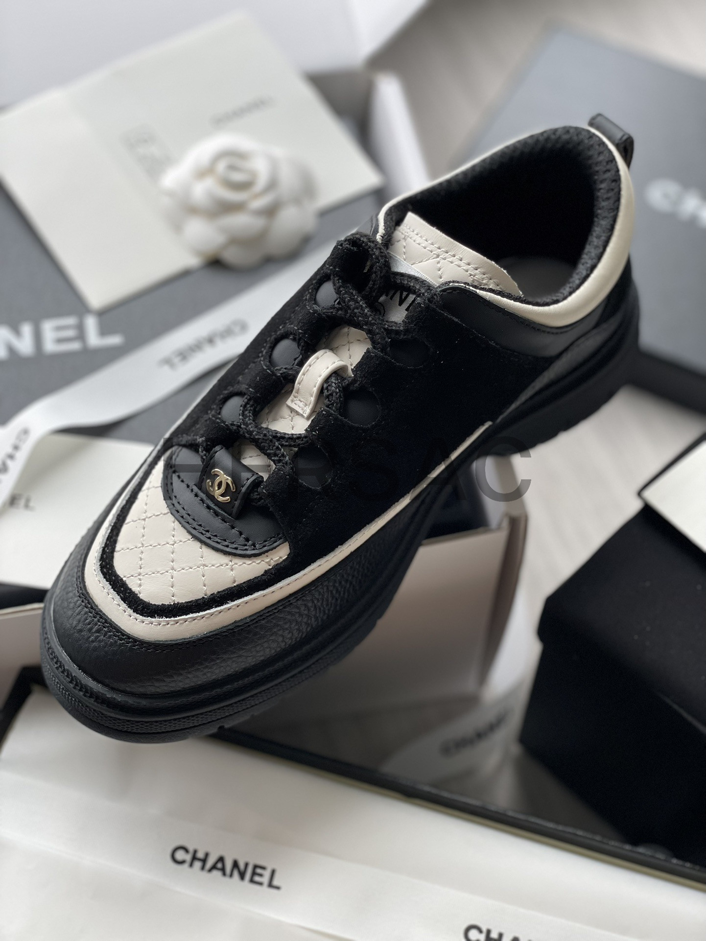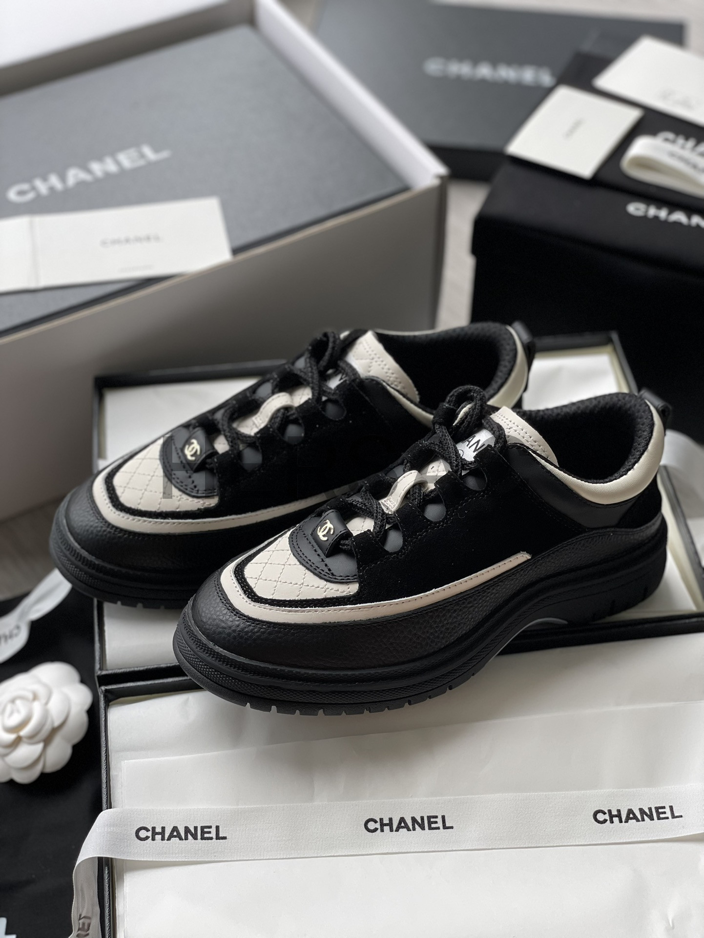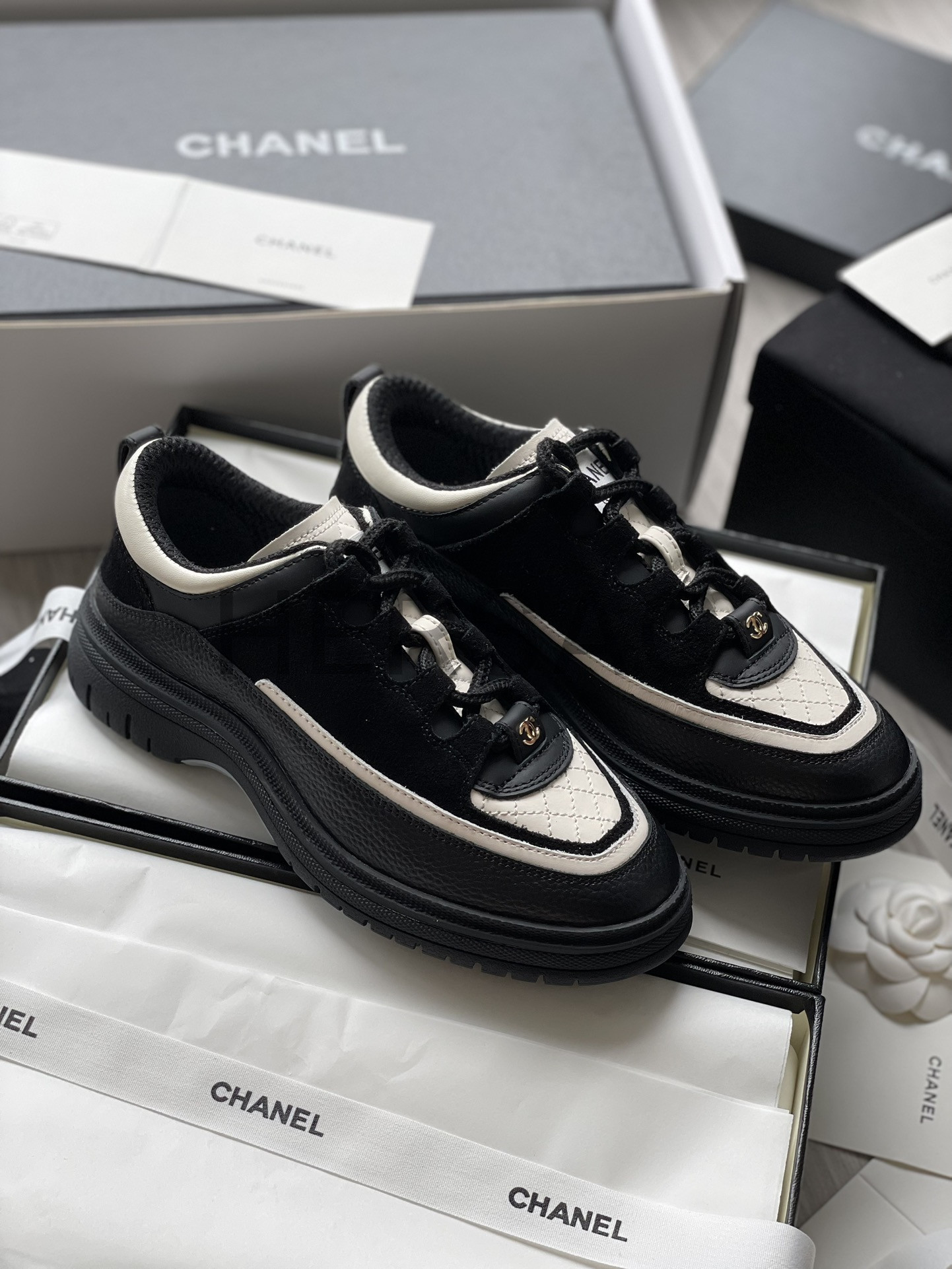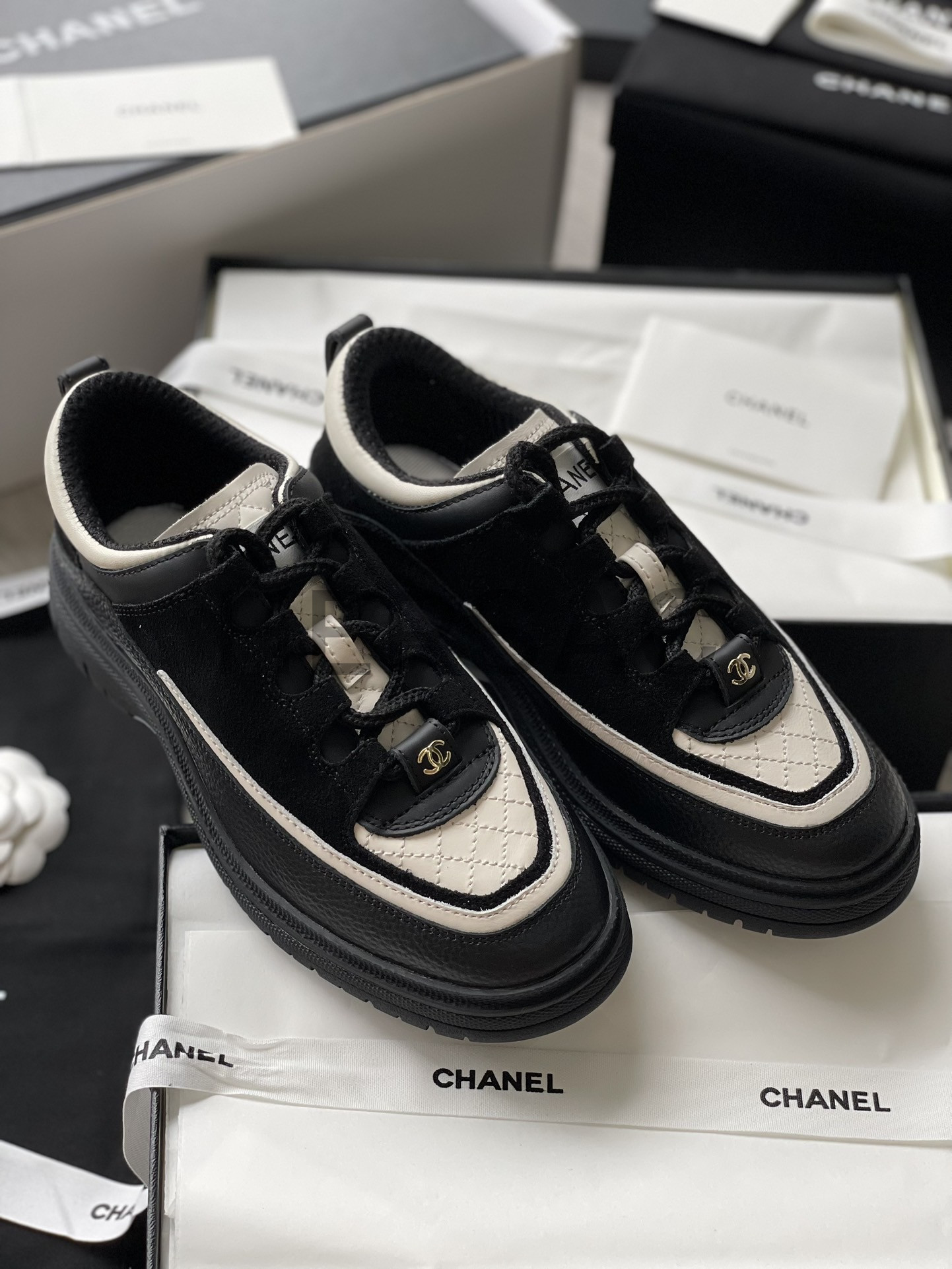 샤넬 스니커즈 카프스킨 스웨이드 카프스킨 램스킨 블랙 화이트 G46258 B21627 U3085
