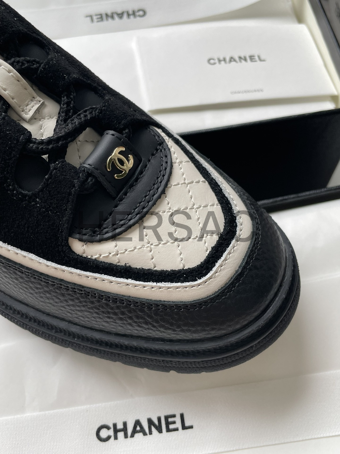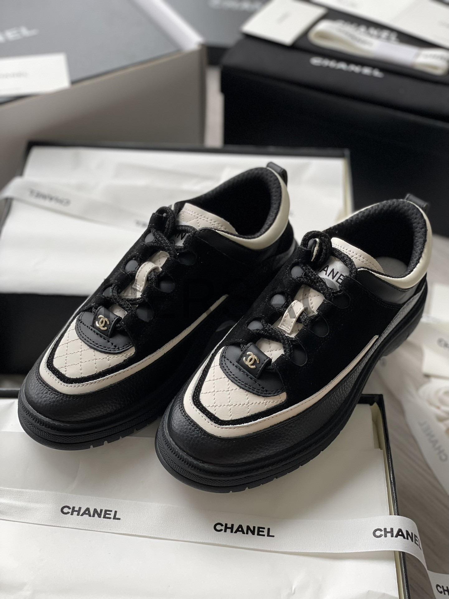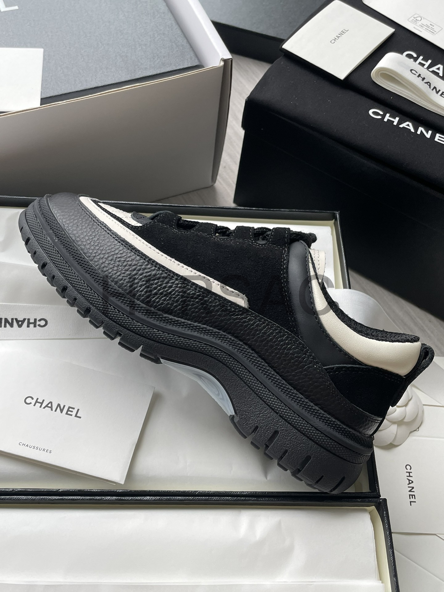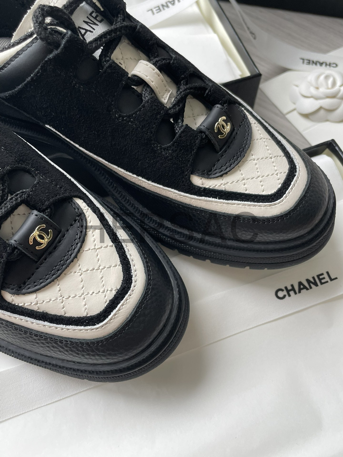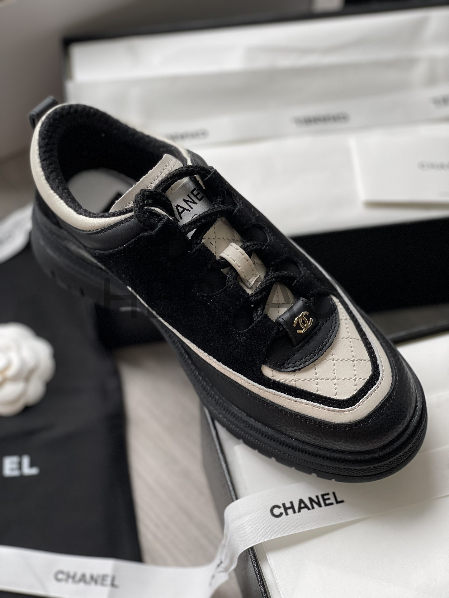 샤넬 스니커즈 카프스킨 스웨이드 카프스킨 램스킨 블랙 화이트 G46258 B21627 U3085