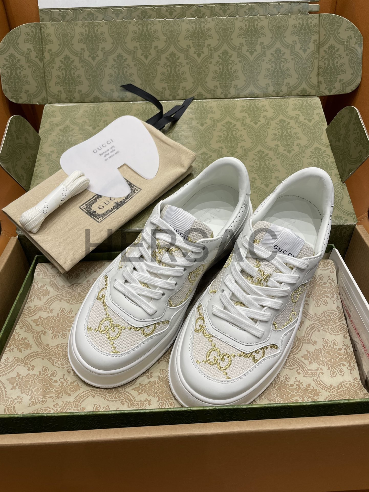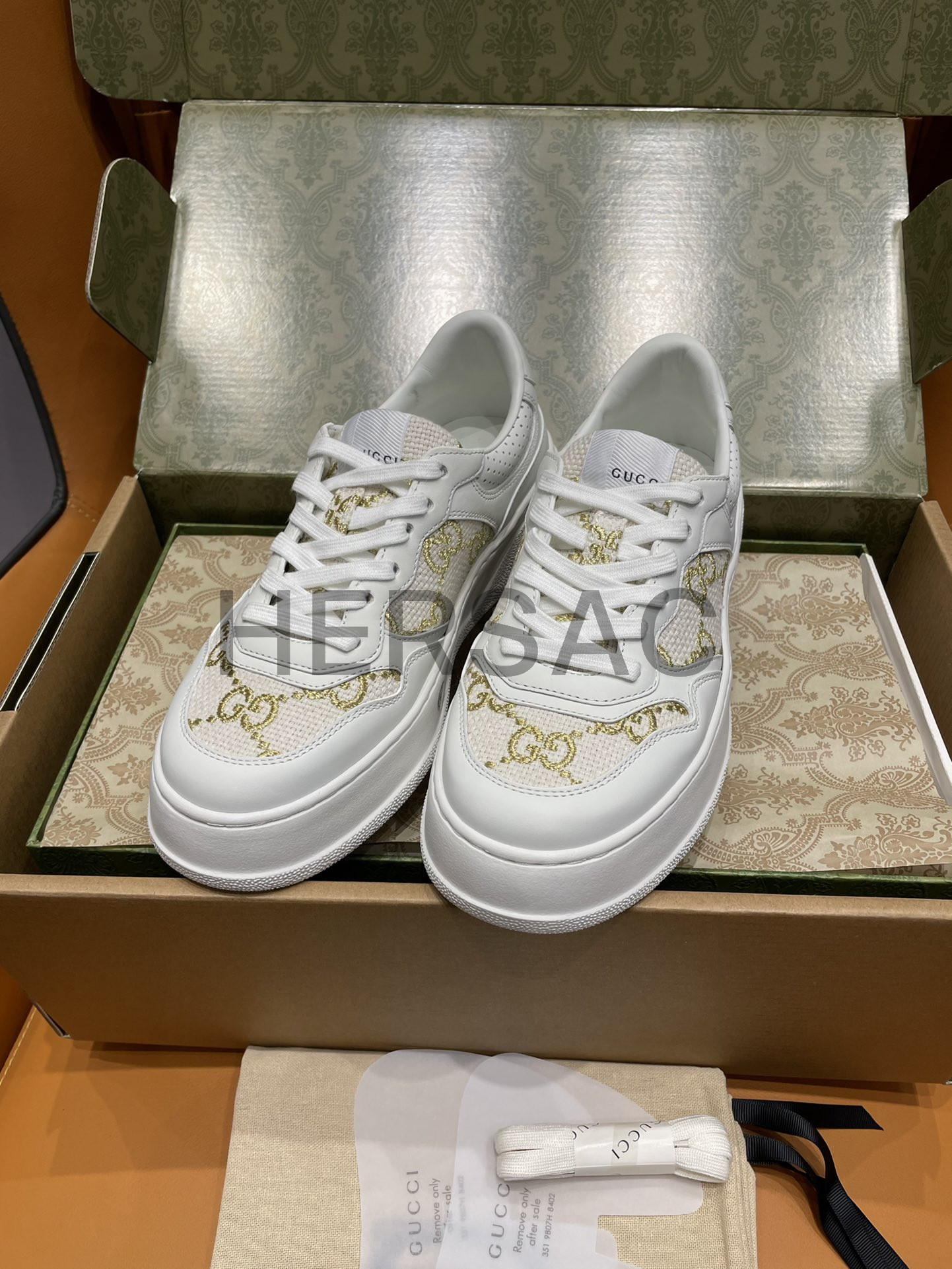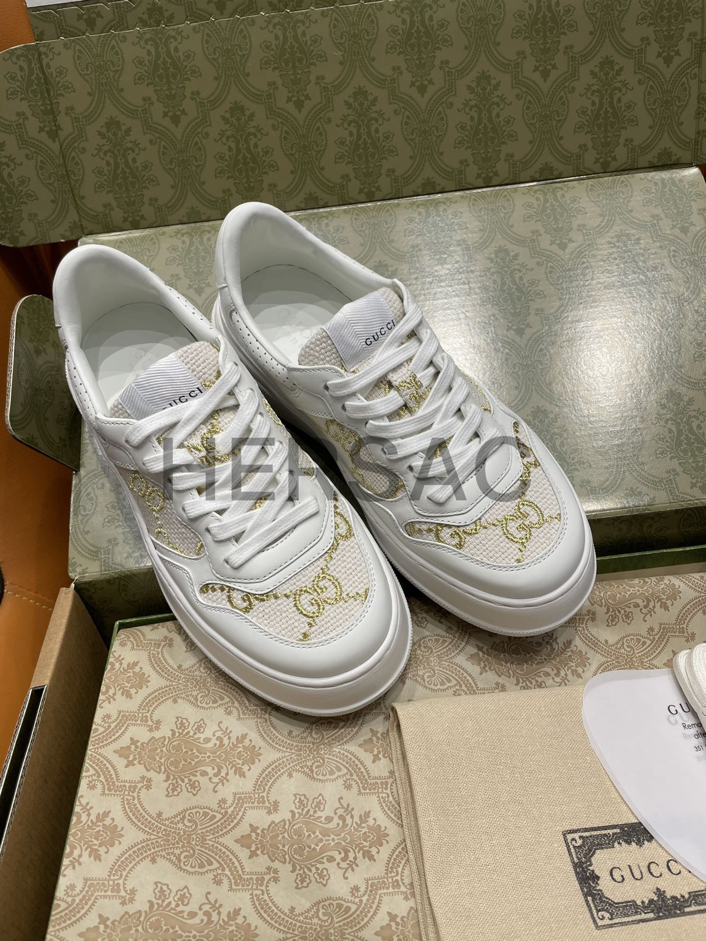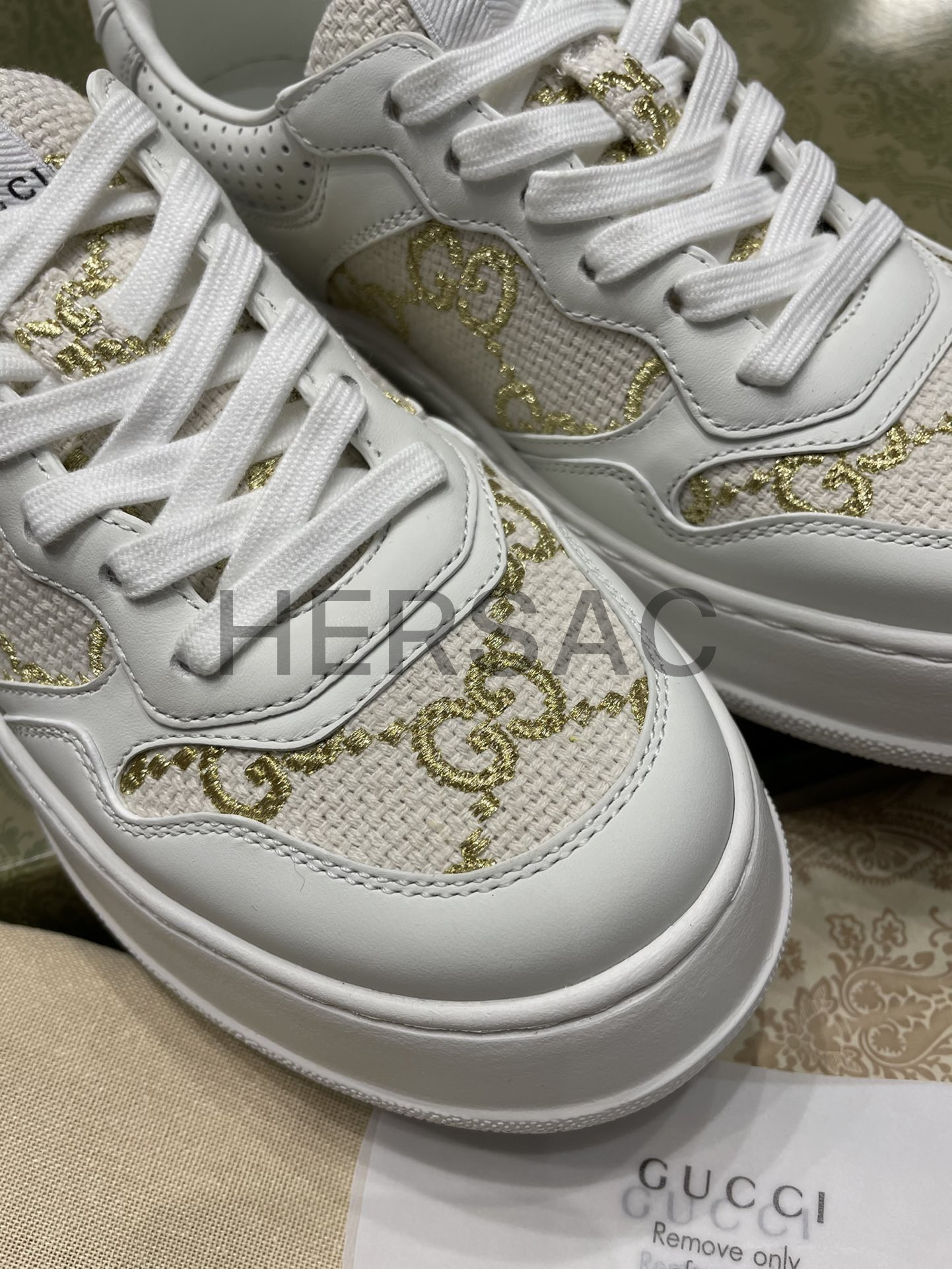 구찌 골드 라메 GG 패브릭 화이트 로우탑 GG 플랫폼 스니커즈 670408 AACXG 9059