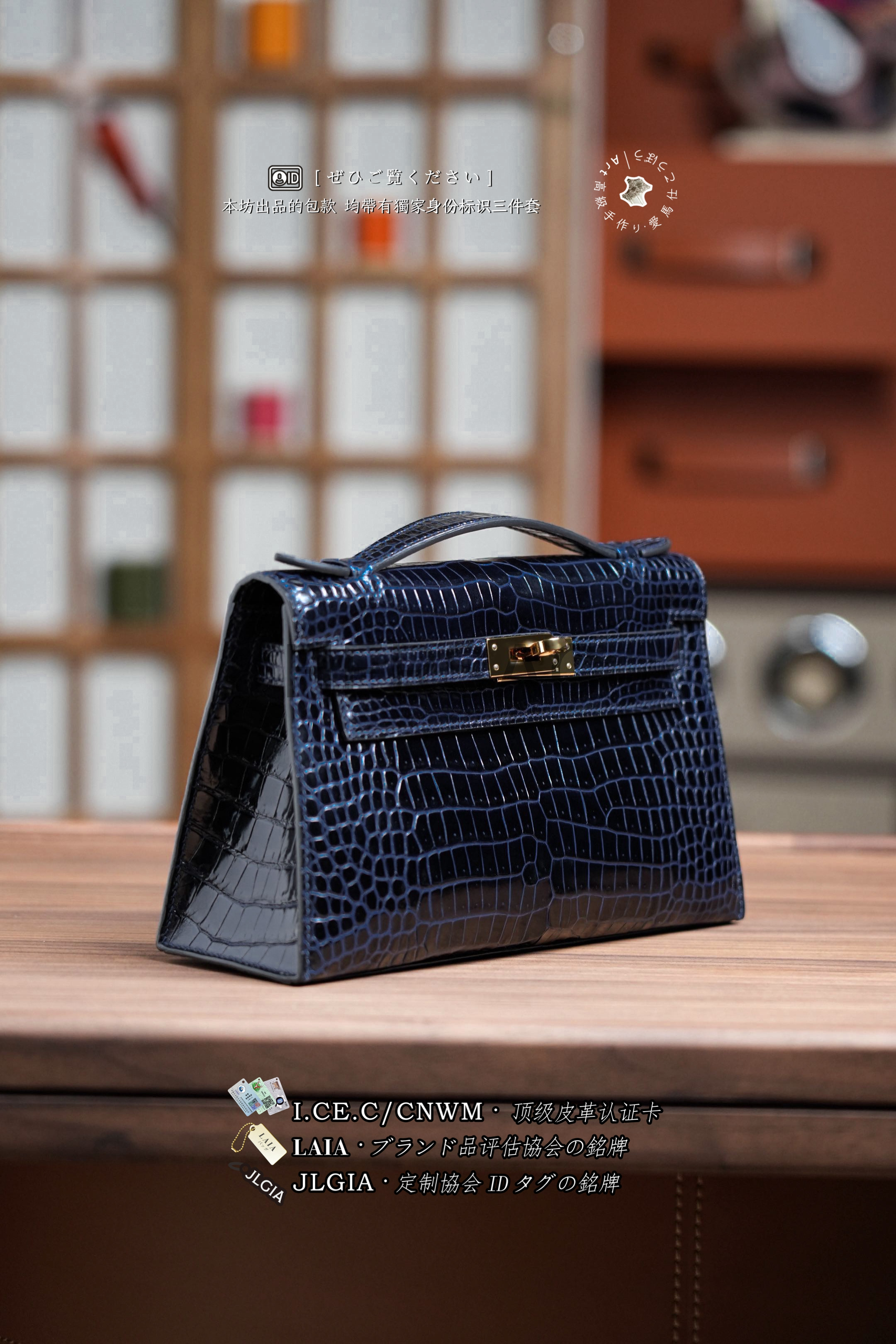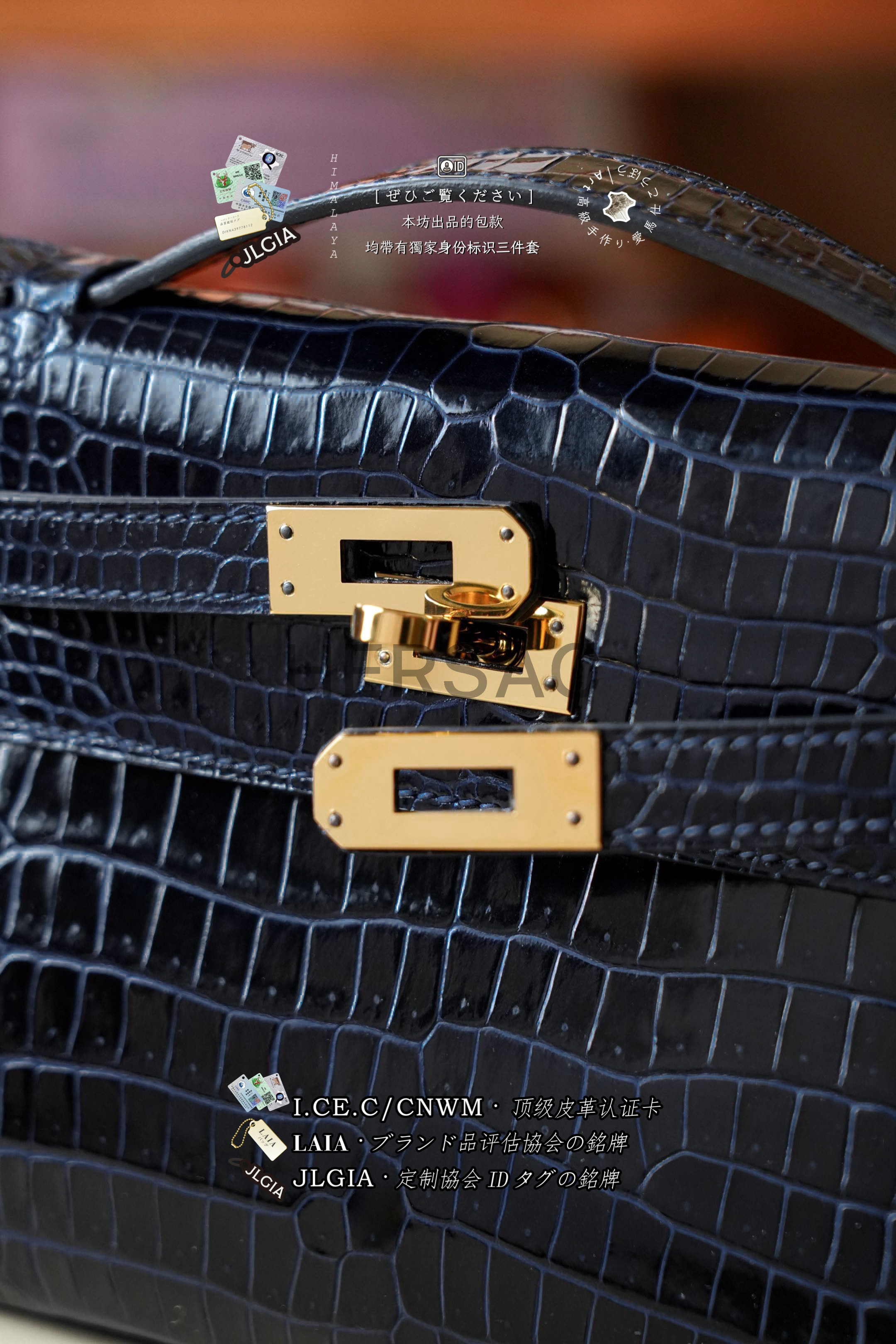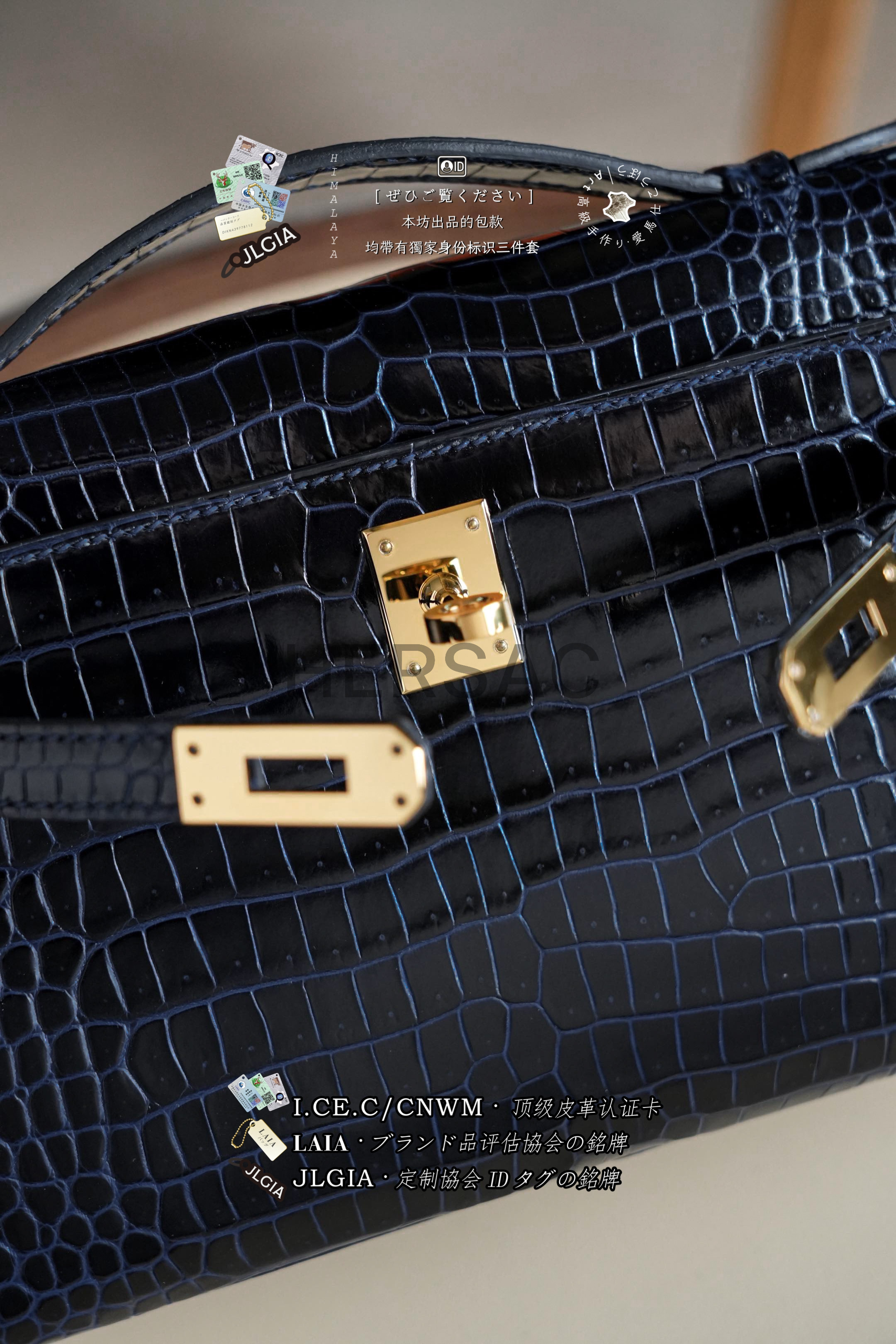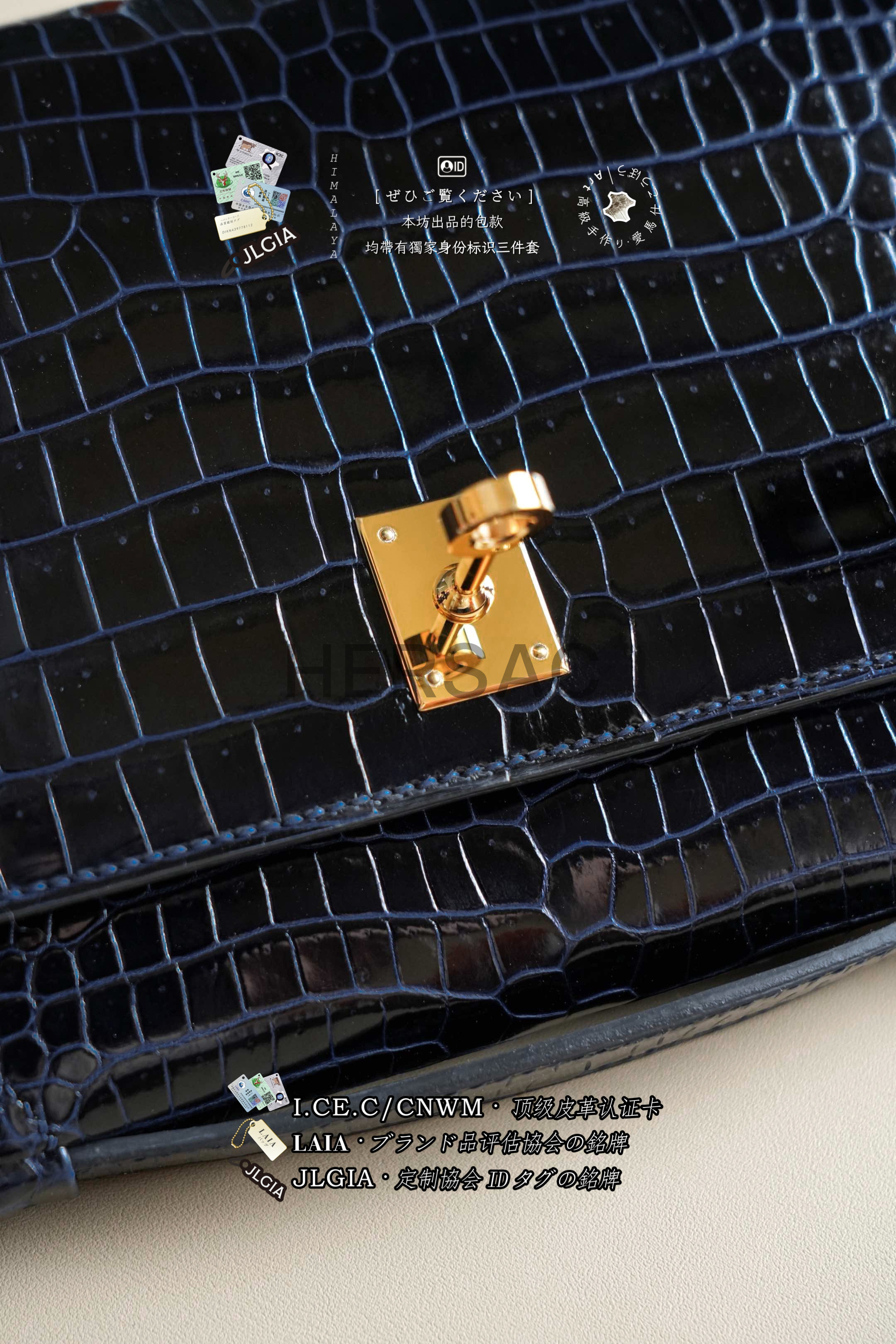 Hermes Mini Kelly I Glossy Porosus Bleu Arine Gold > Premium 토트백