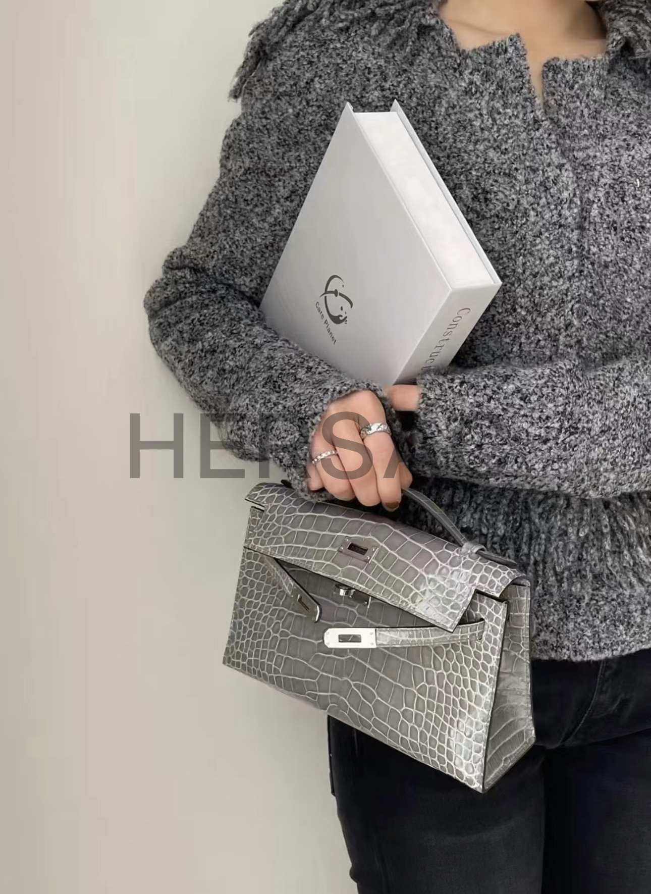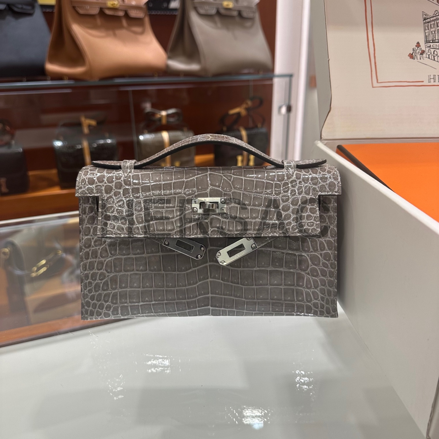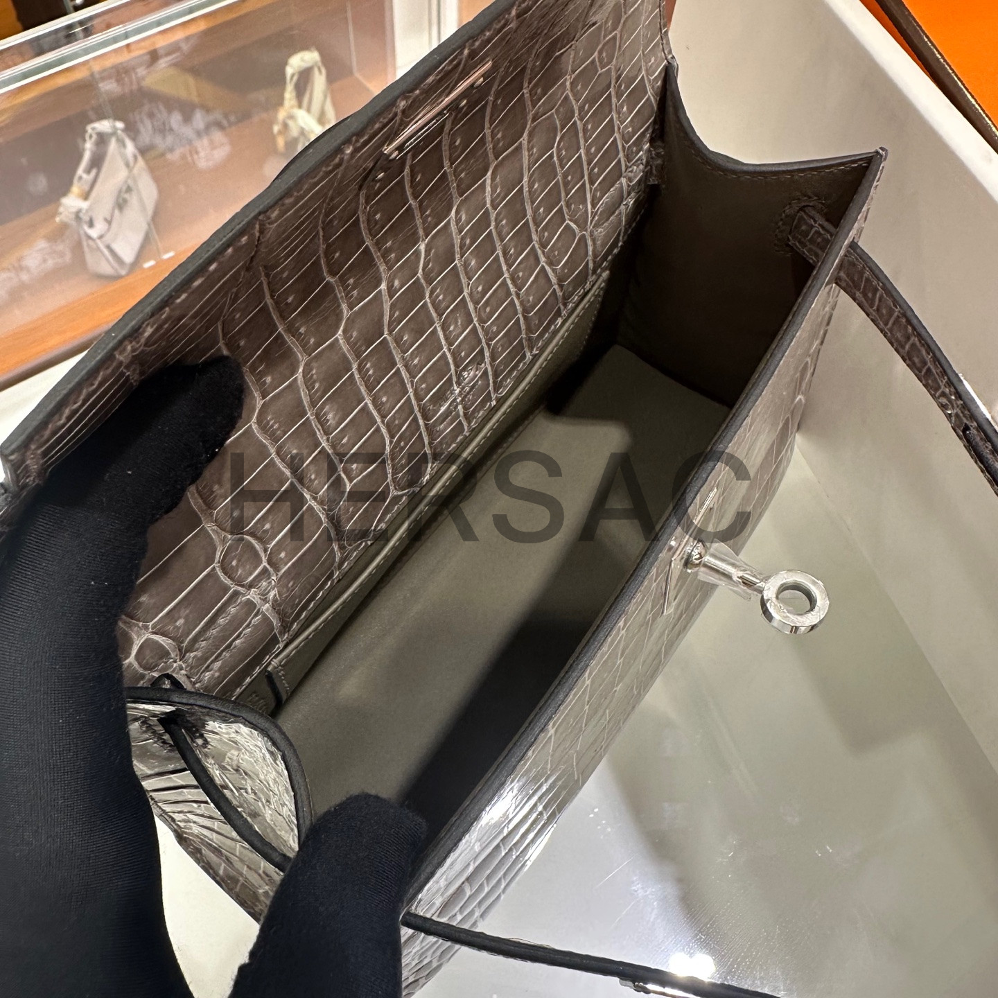 Hermes Mini Kelly I Porosus Gris Ciment Silver > 토트백