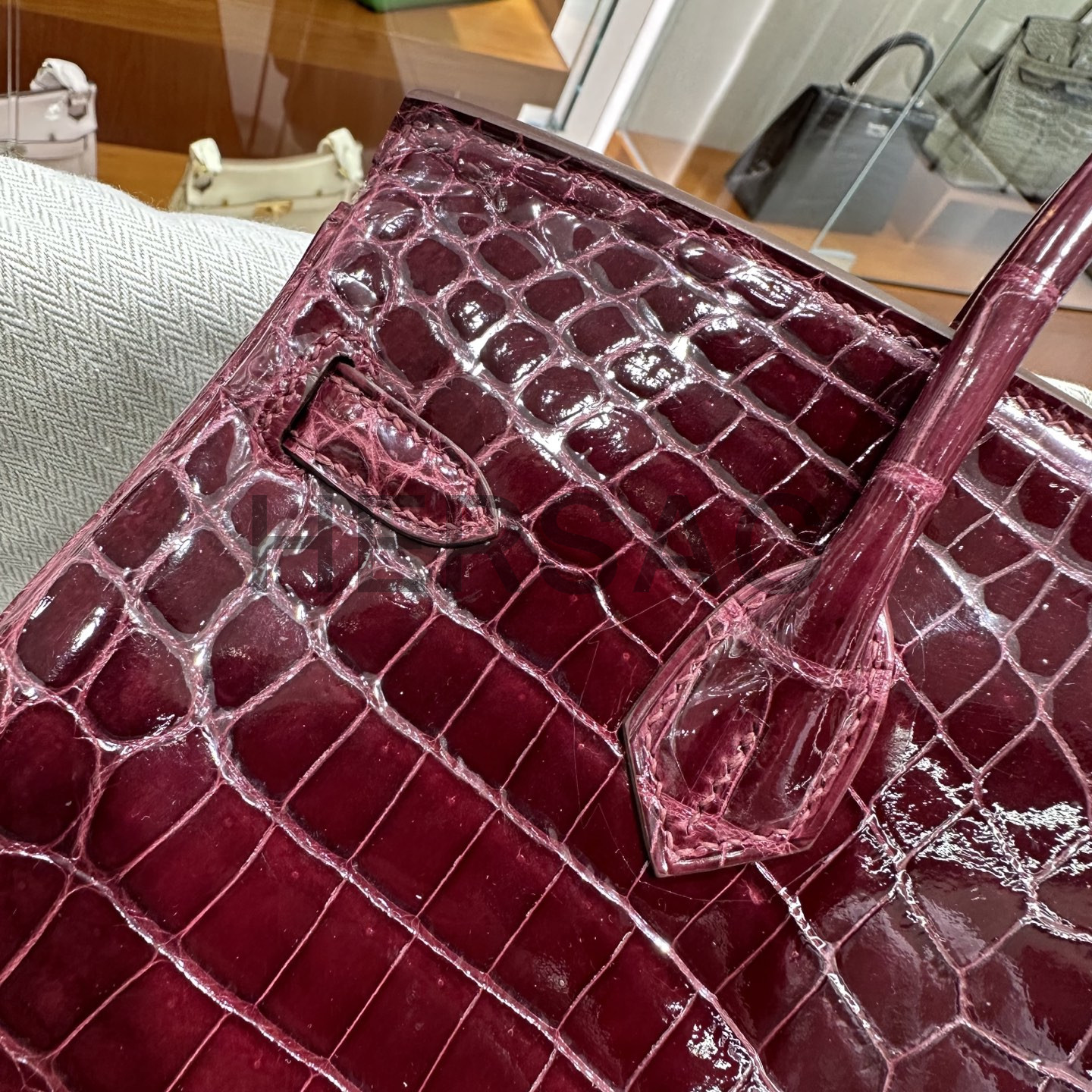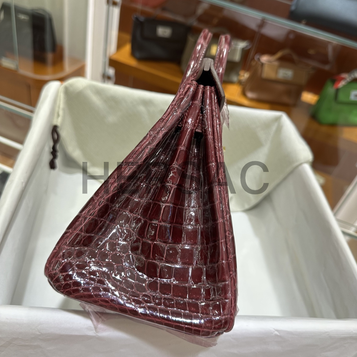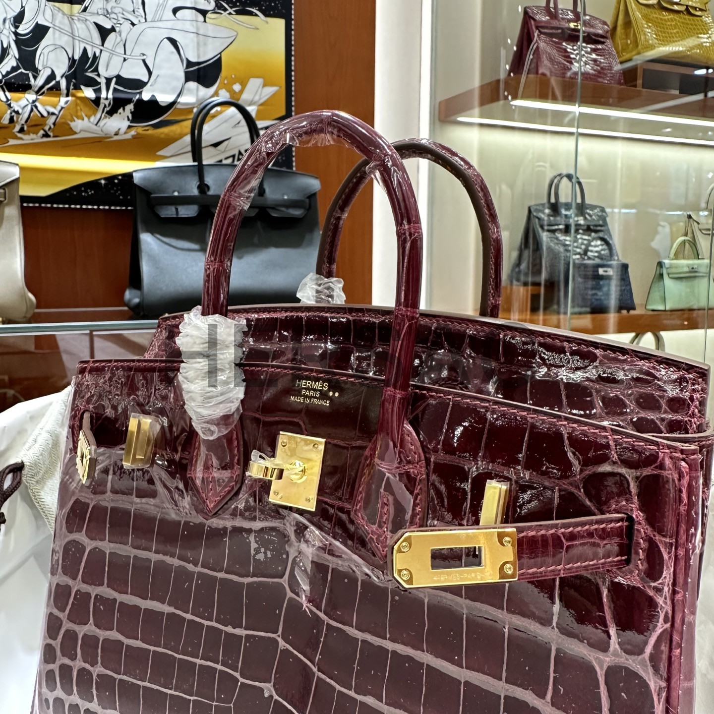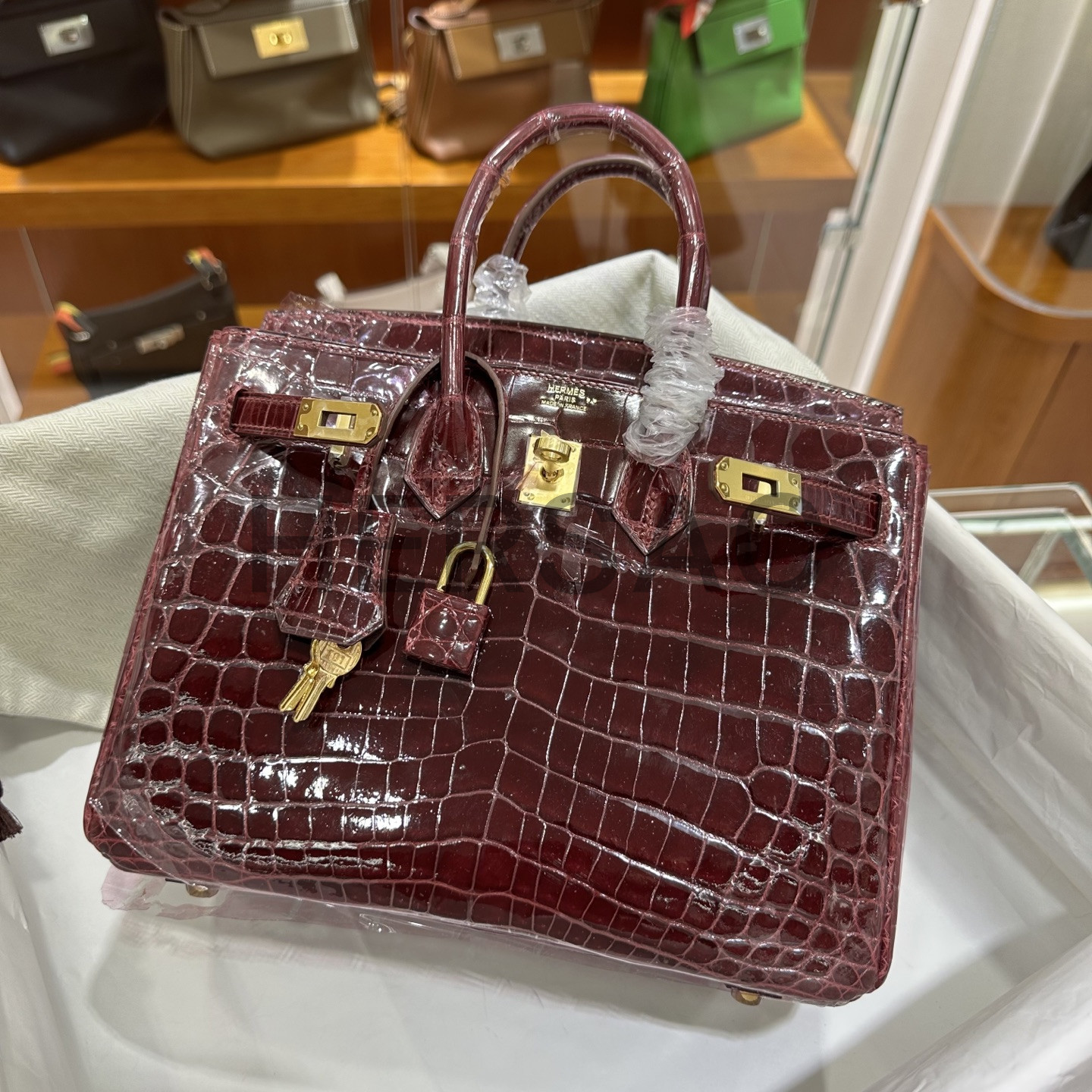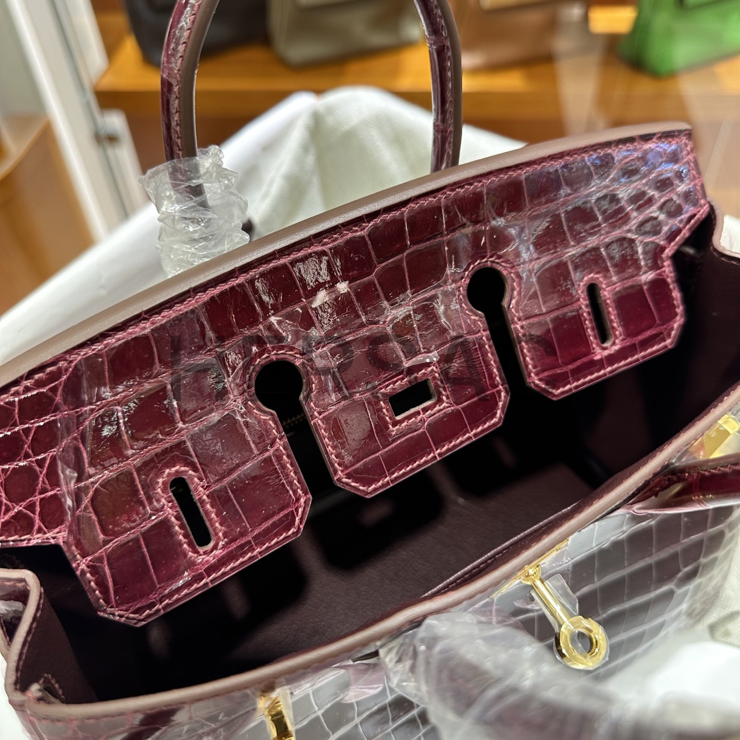 에르메스 버킨 25 나일 악어 보르도 골드