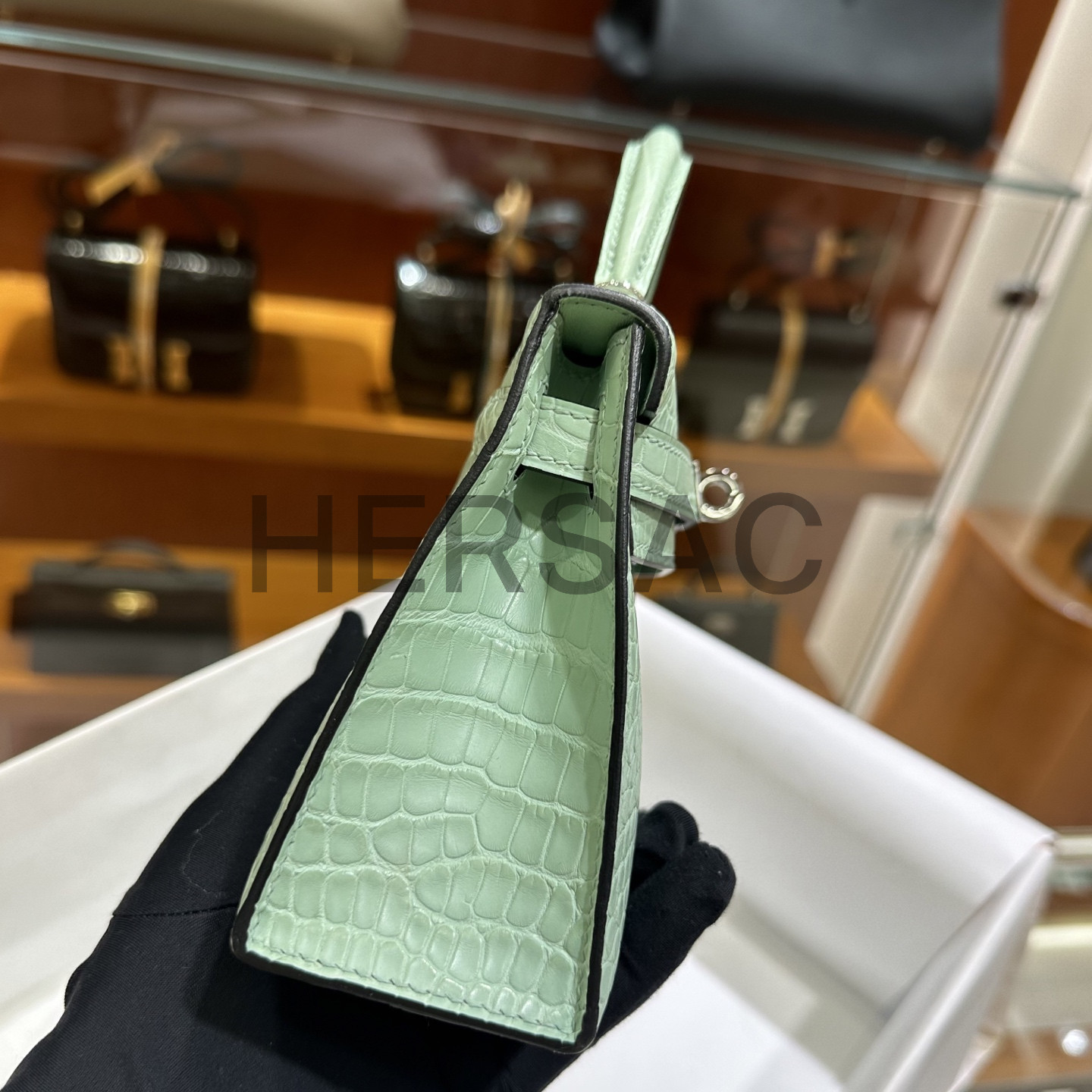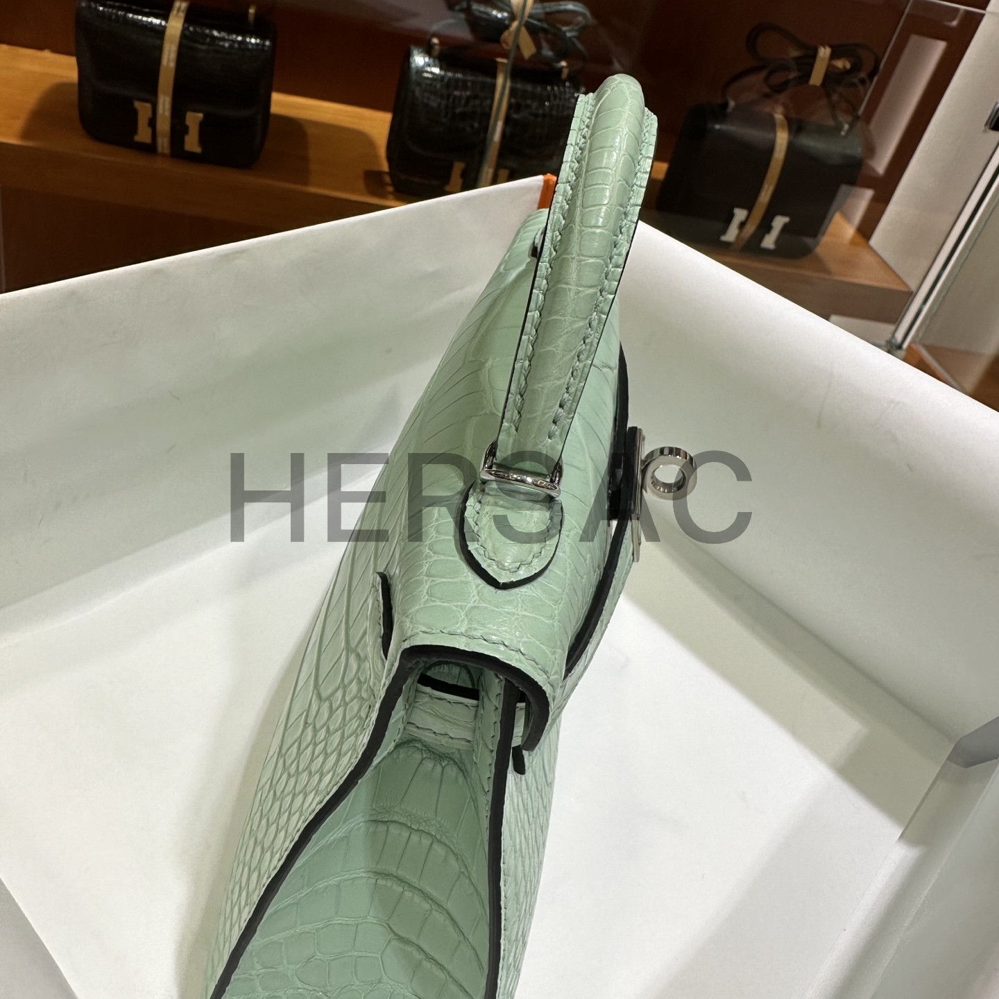 Hermes Kelly Mini II Alligator Vert deau Silver > 크로스백