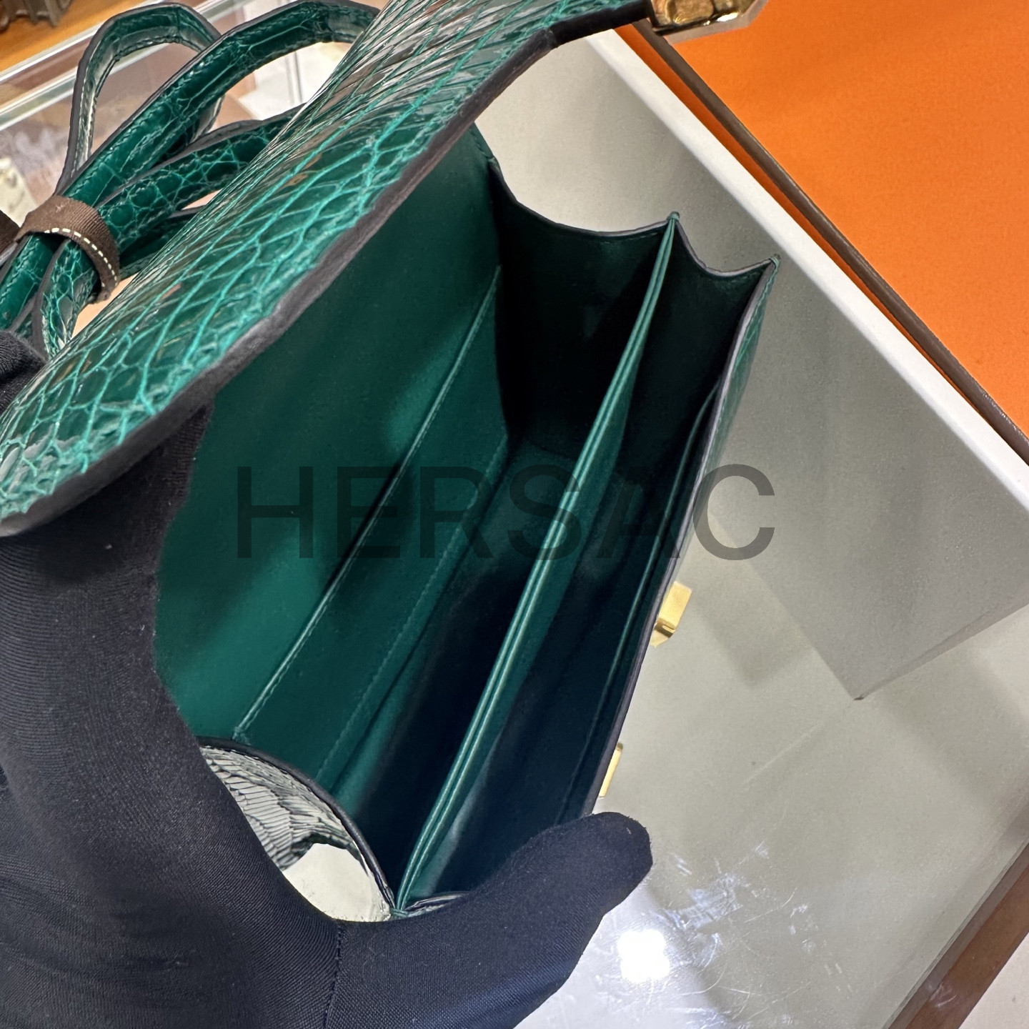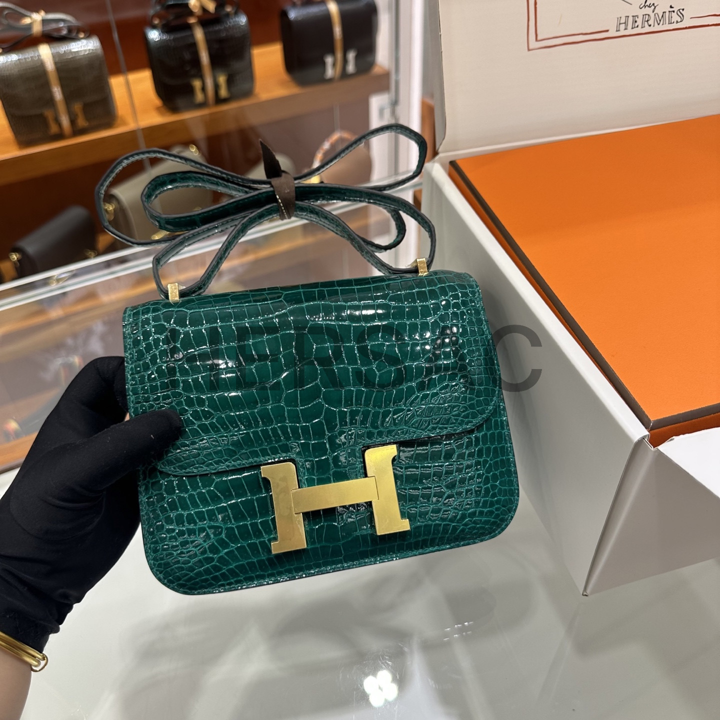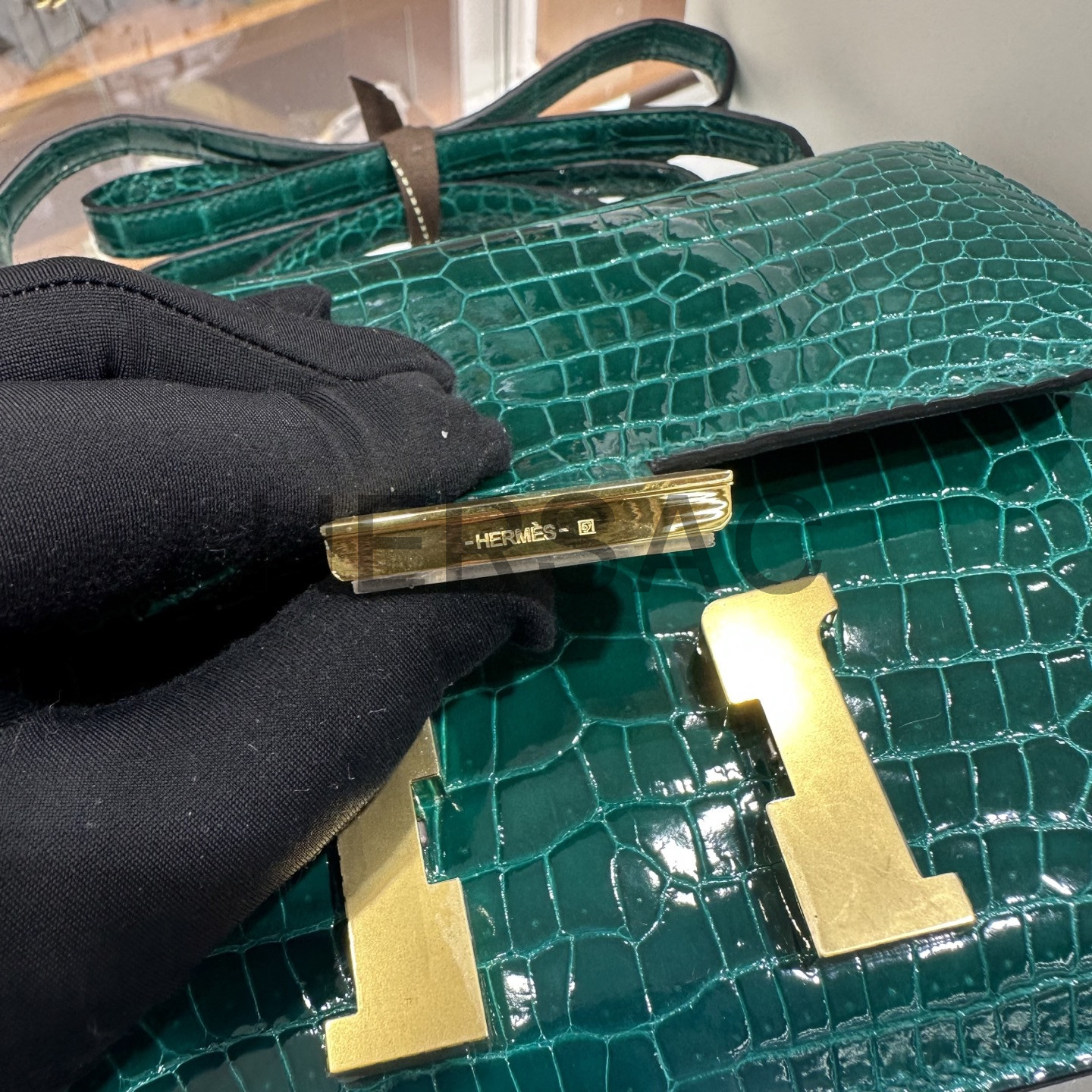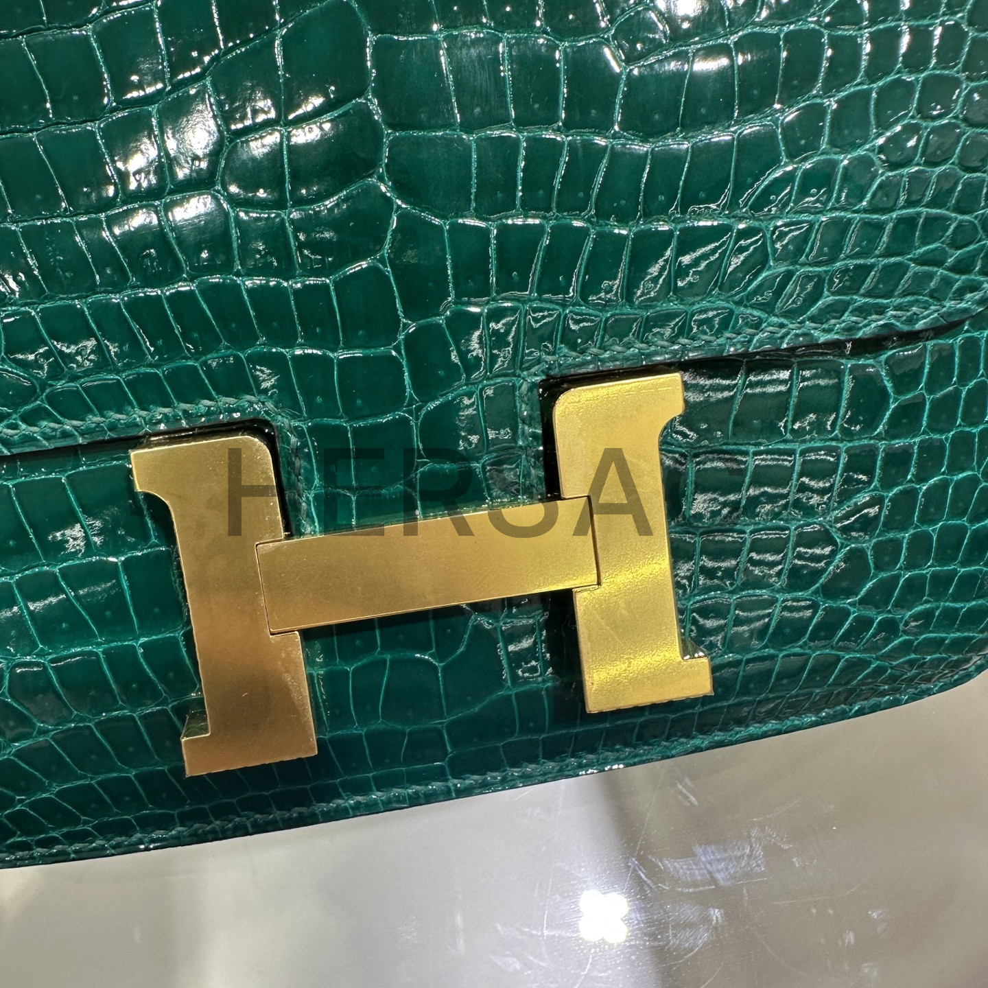 에르메스 콘스탄스 19 크로커다일/엘리게이터 버티그 에메랄드 골드