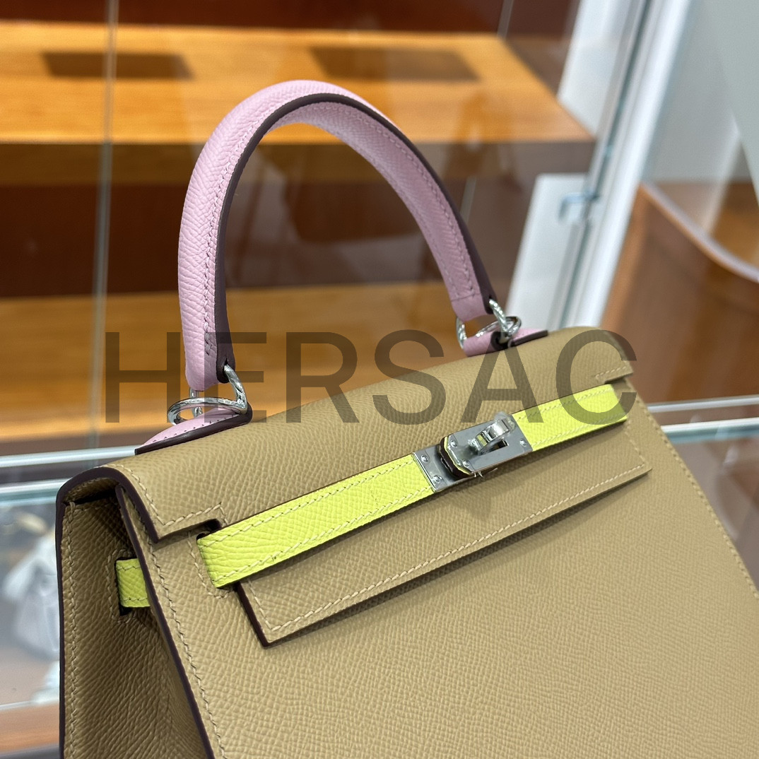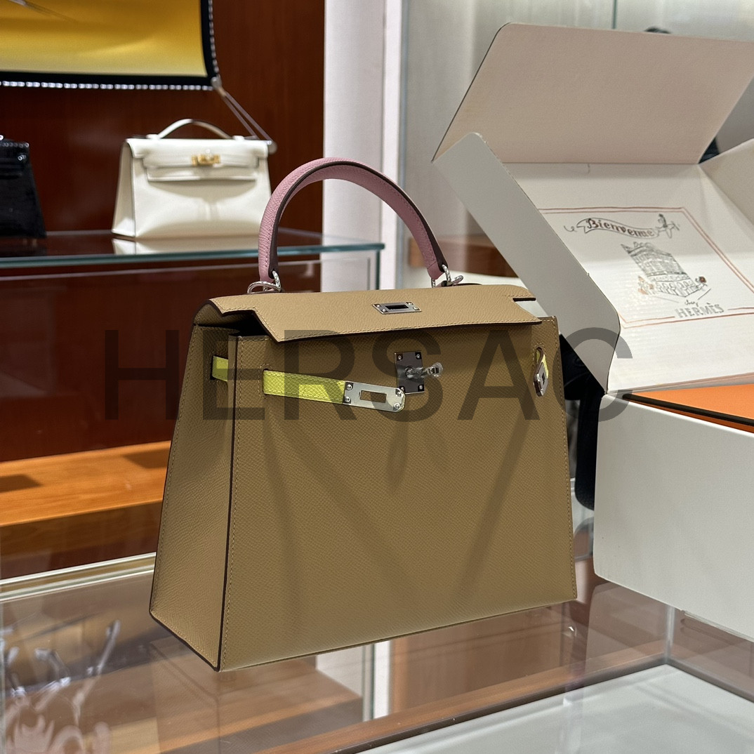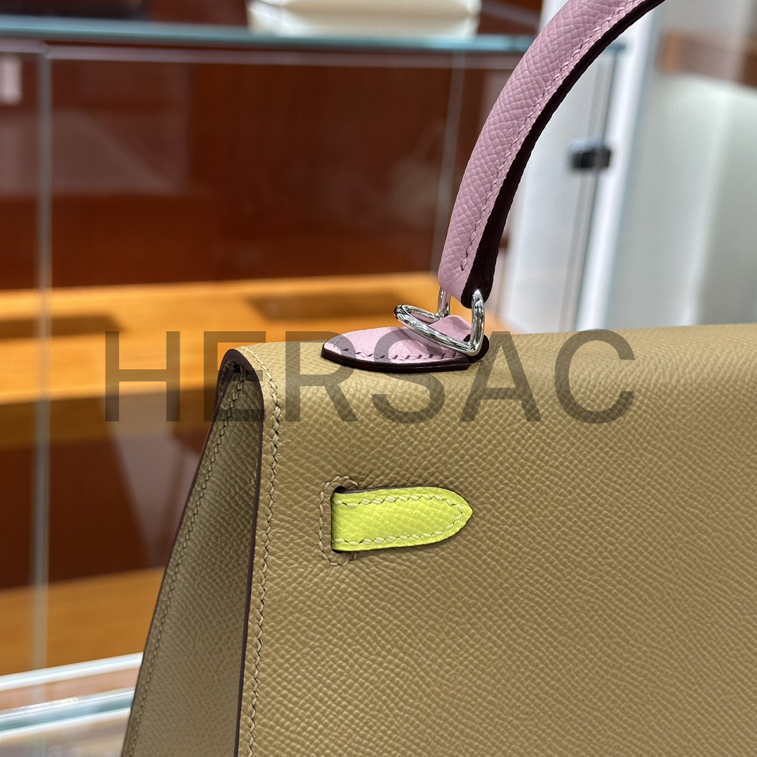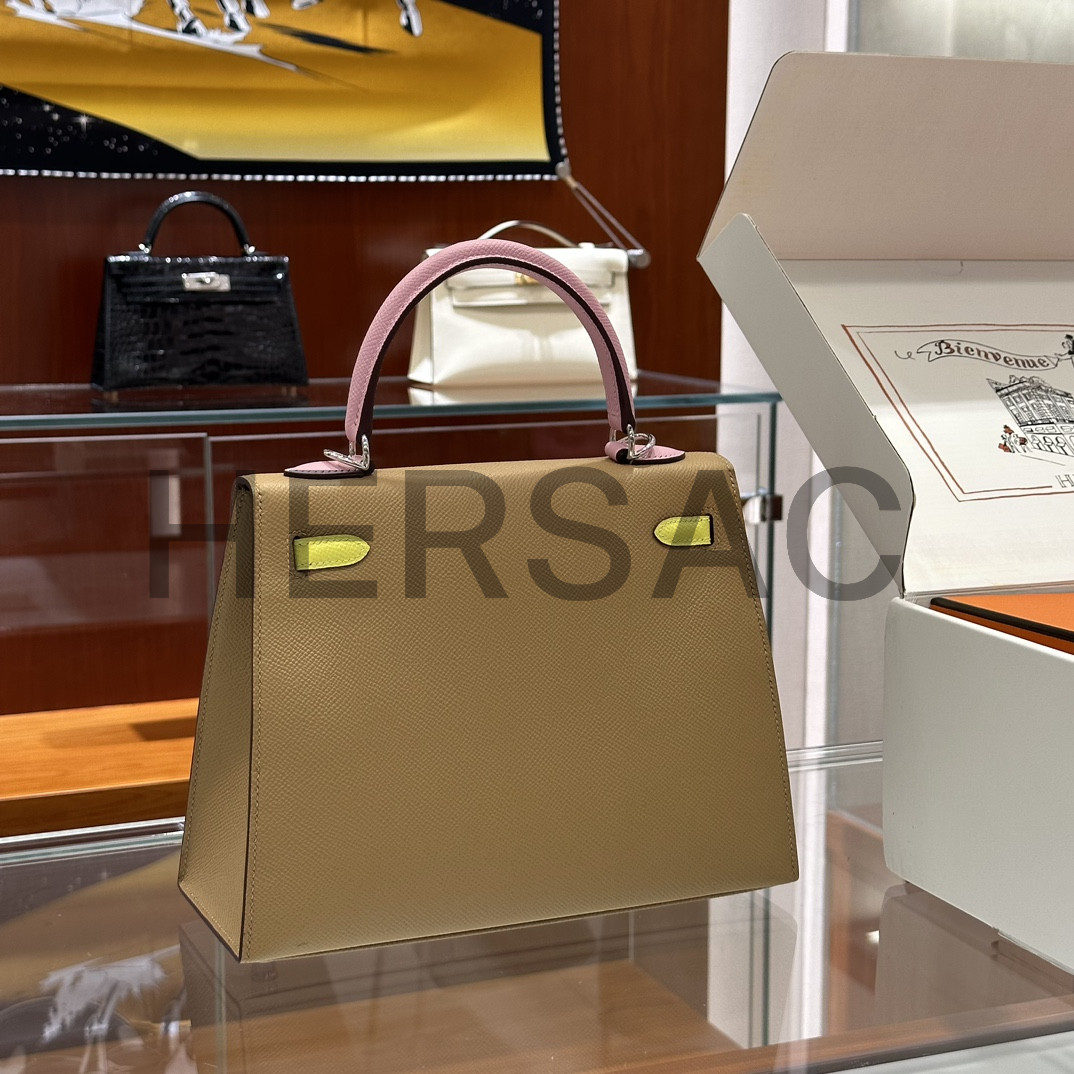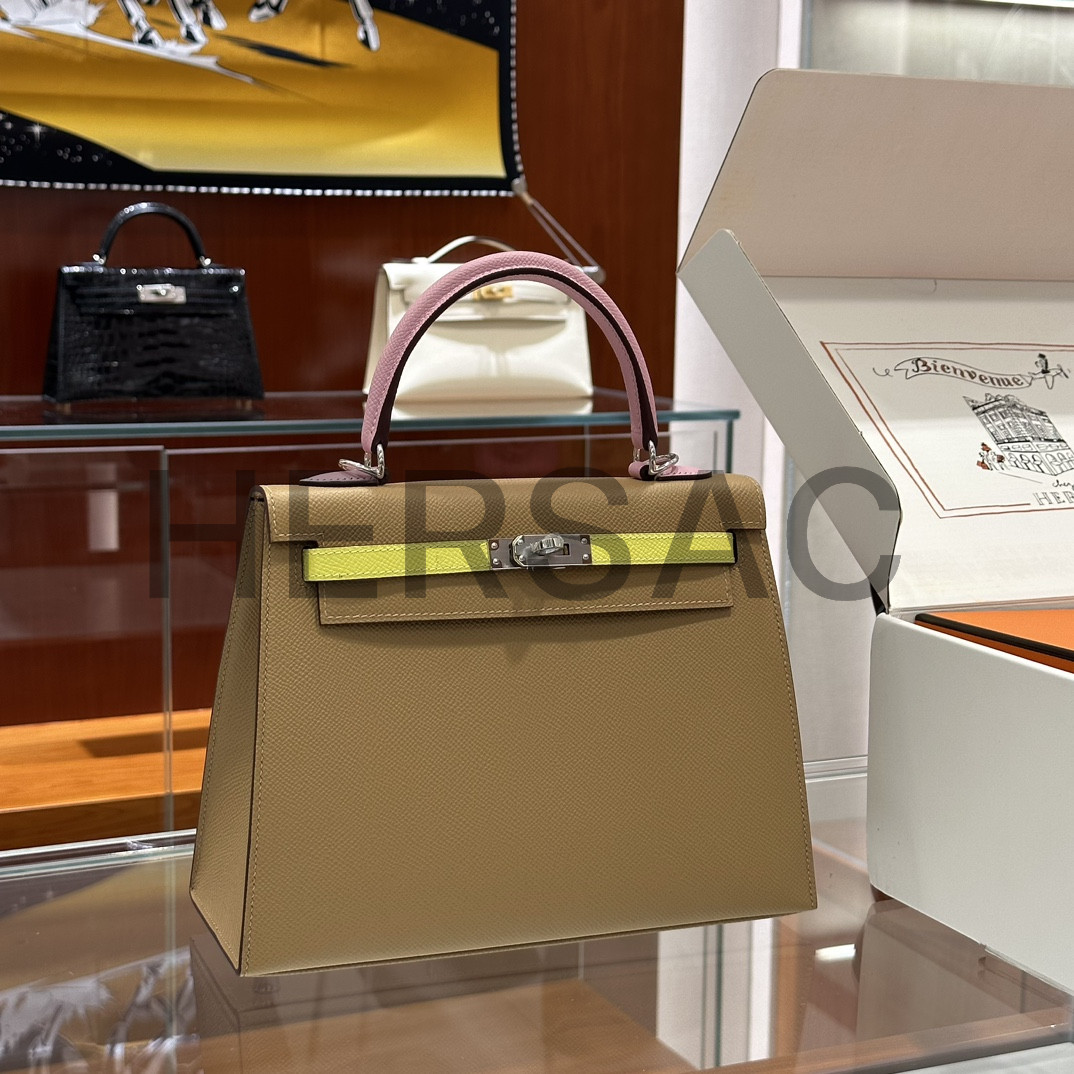 Hermes Kelly 25 Epsom Chai Mauve Sylvestre Lime Silver > 크로스백