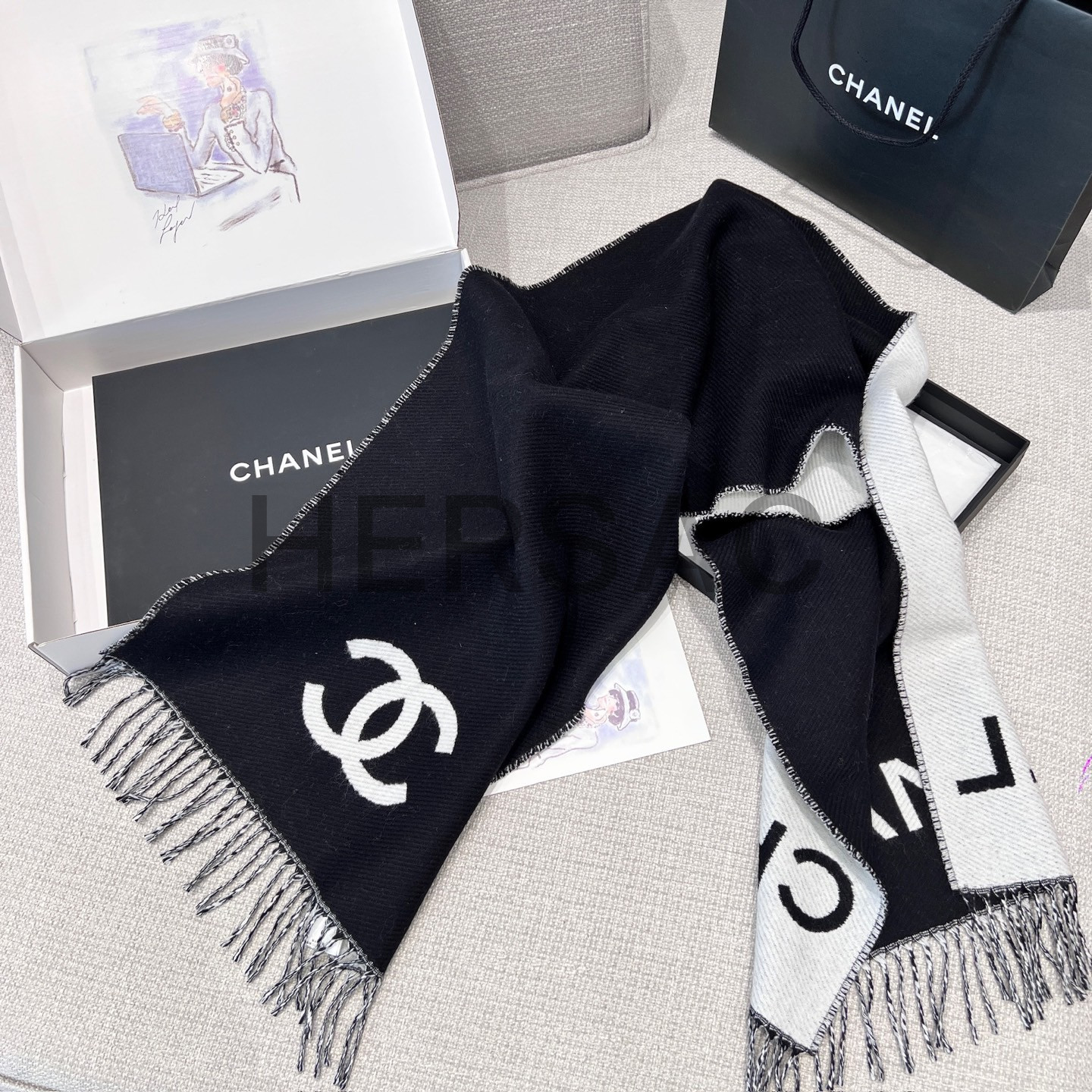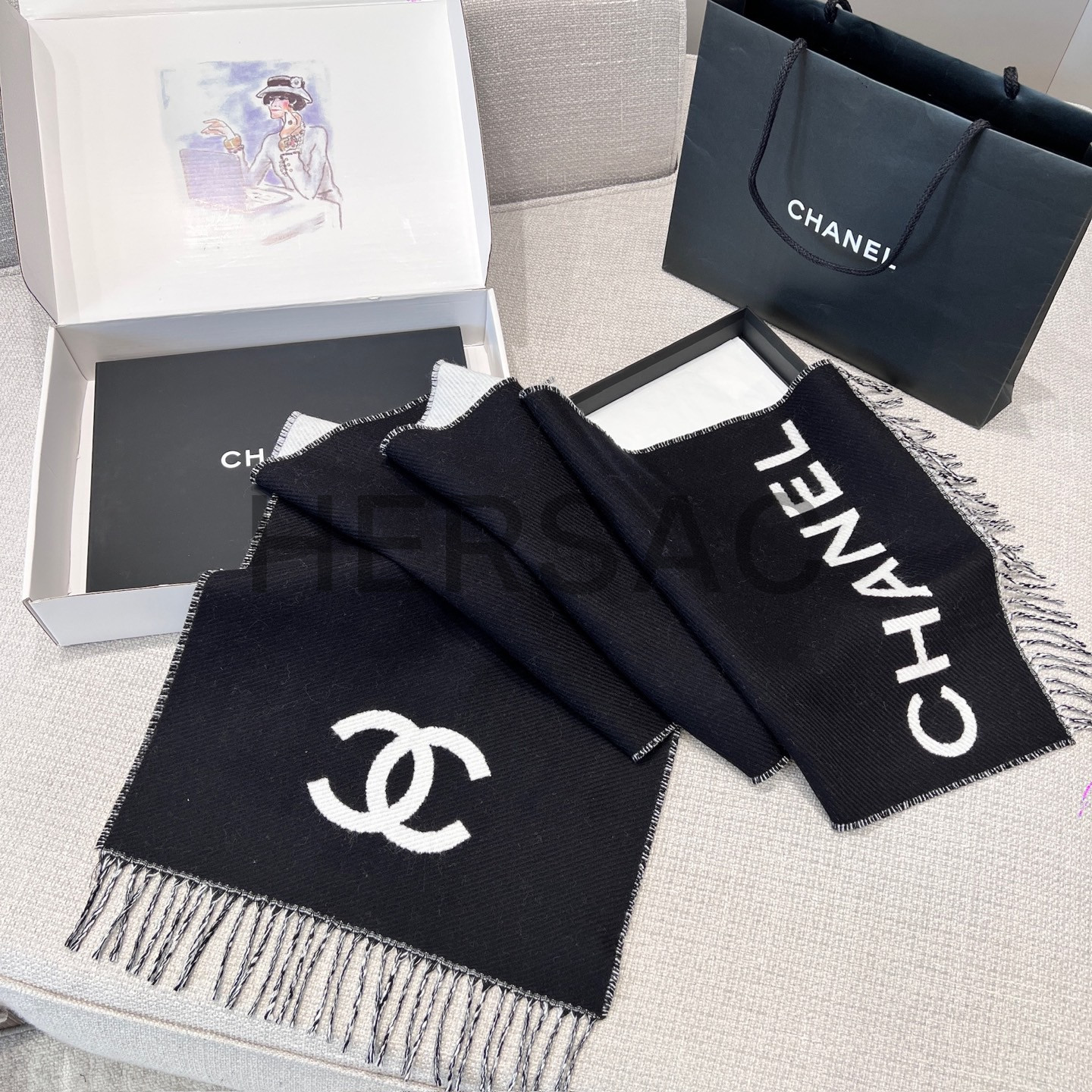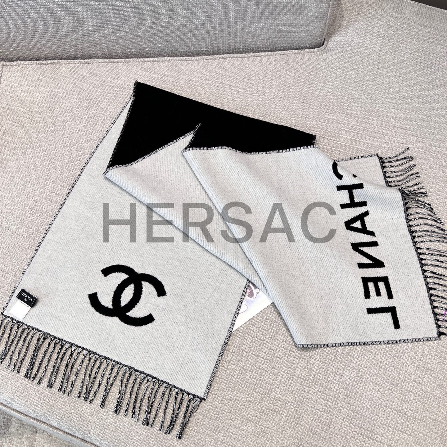 샤넬 CC 로고 프린지 트림 울과 캐시미어 플리스 스카프 AAB010-B20409-U0682