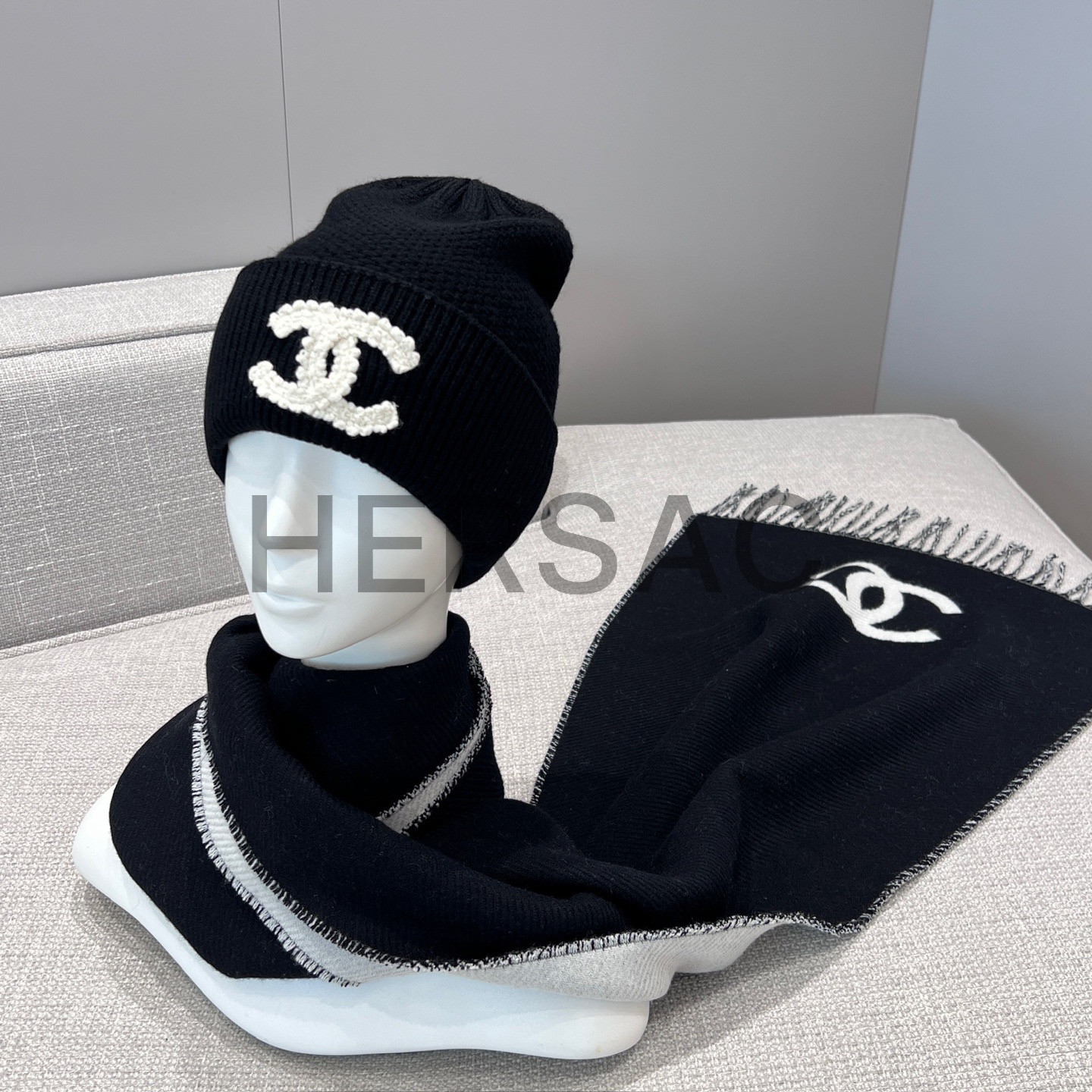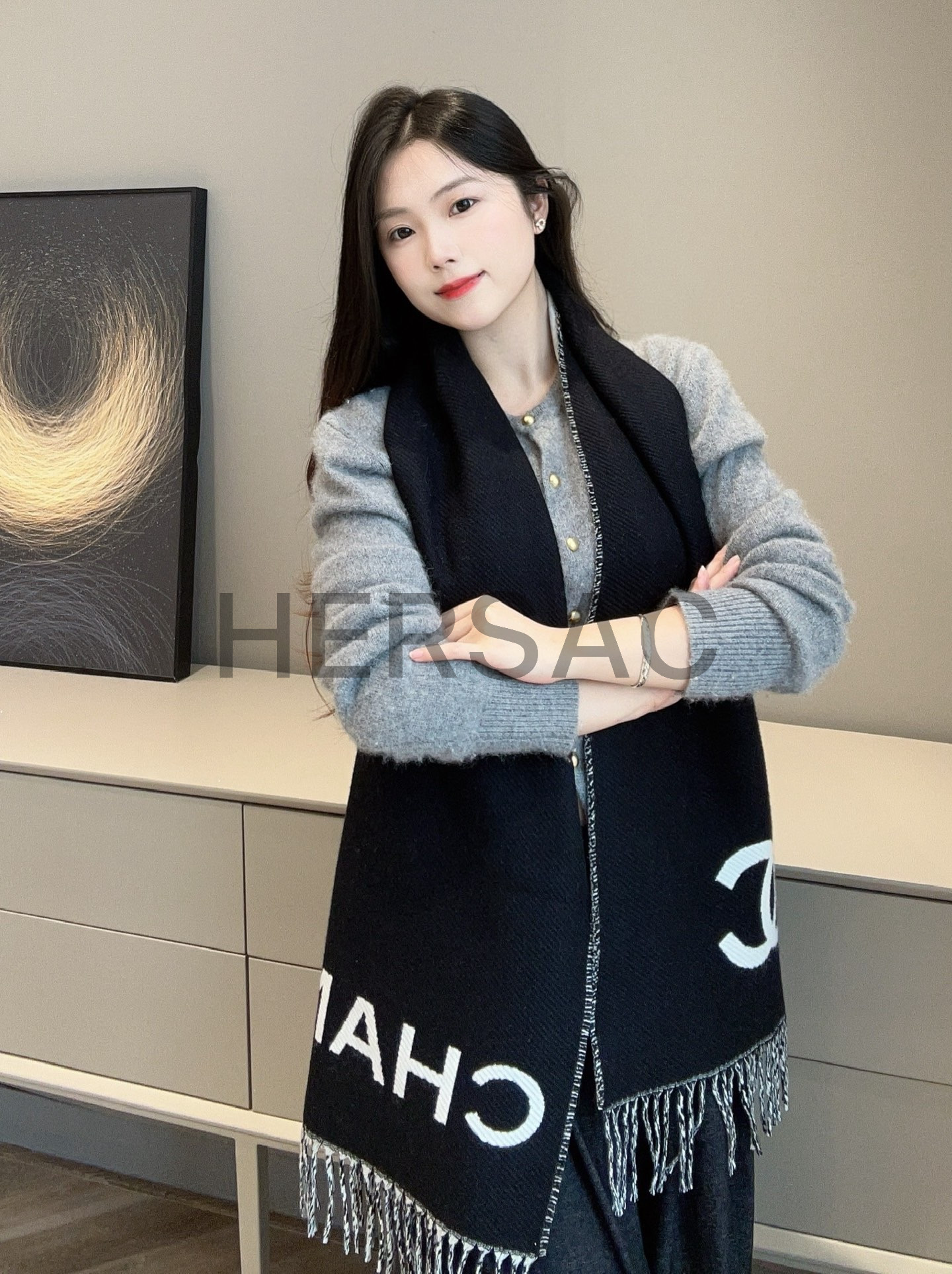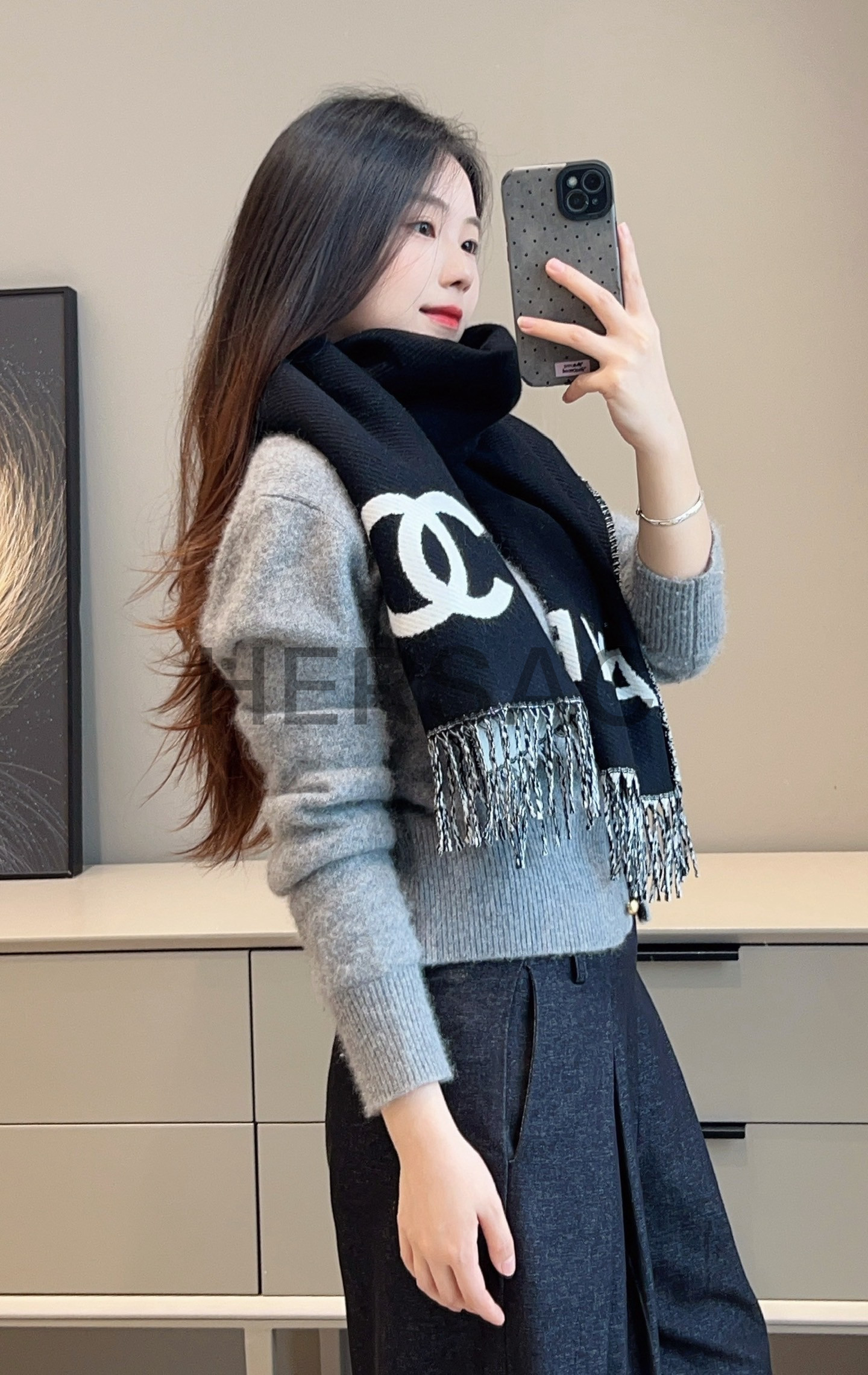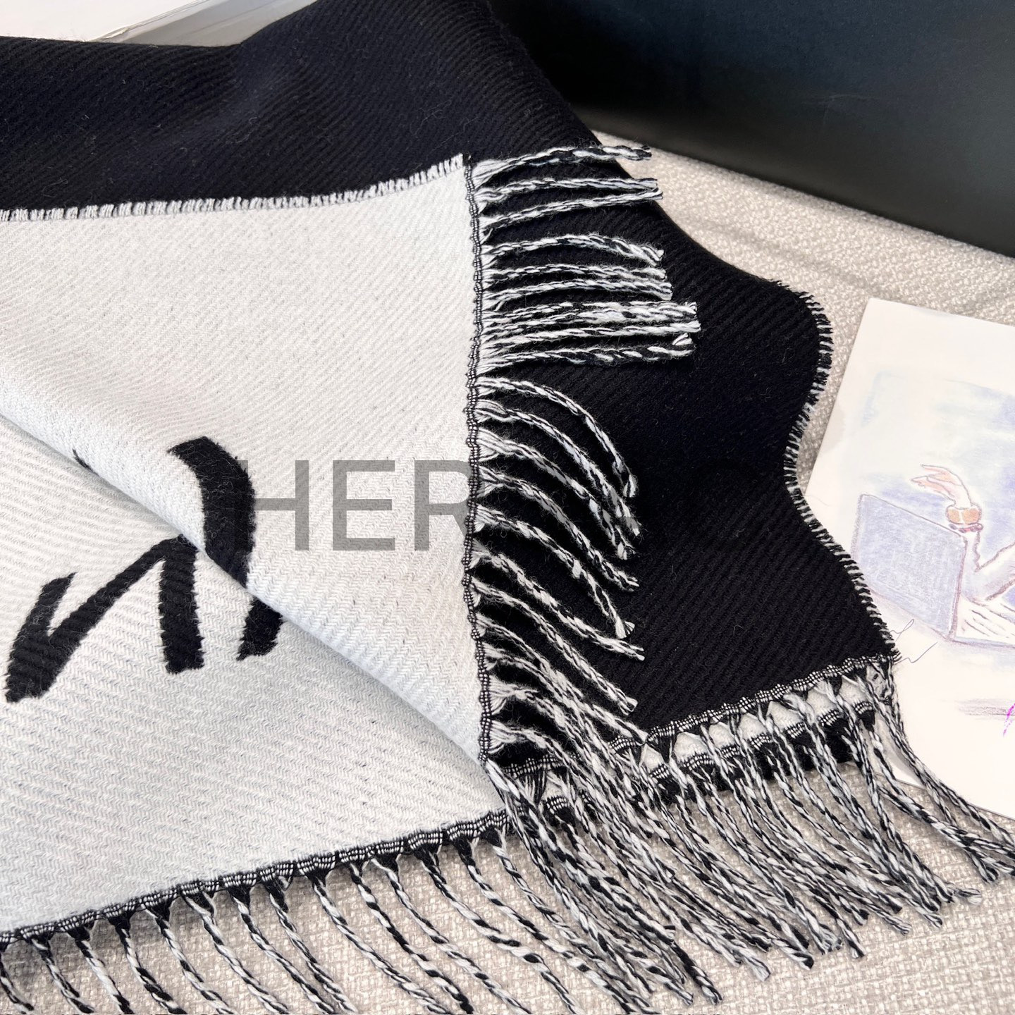 샤넬 CC 로고 프린지 트림 울과 캐시미어 플리스 스카프 AAB010-B20409-U0682